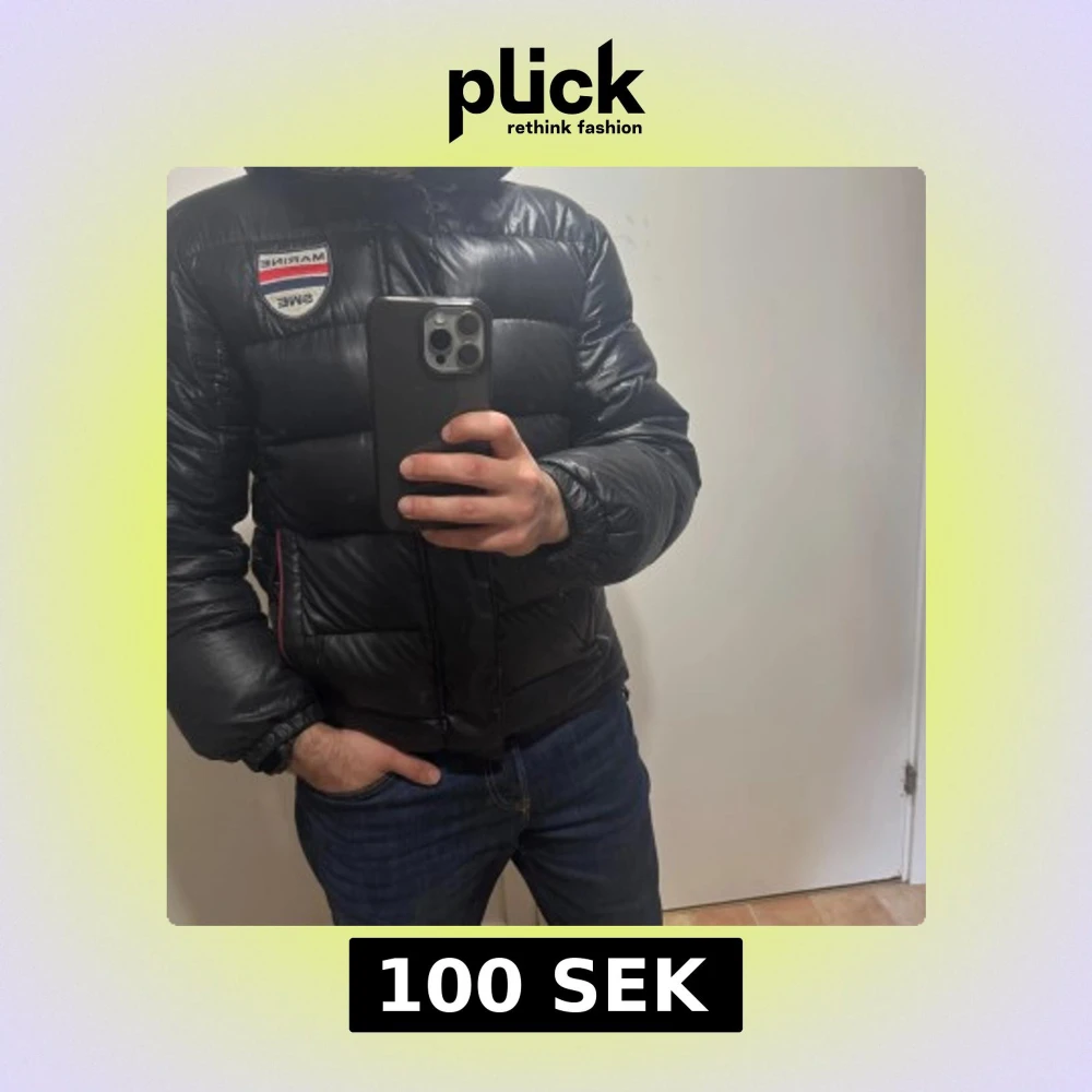 Svart pufferjacka från Marine SWE med broderad patch på bröstet. Jackan har dragkedja framtill och röda detaljer längs sidorna. Perfekt för kyligare dagar och har en klassisk pufferlook.