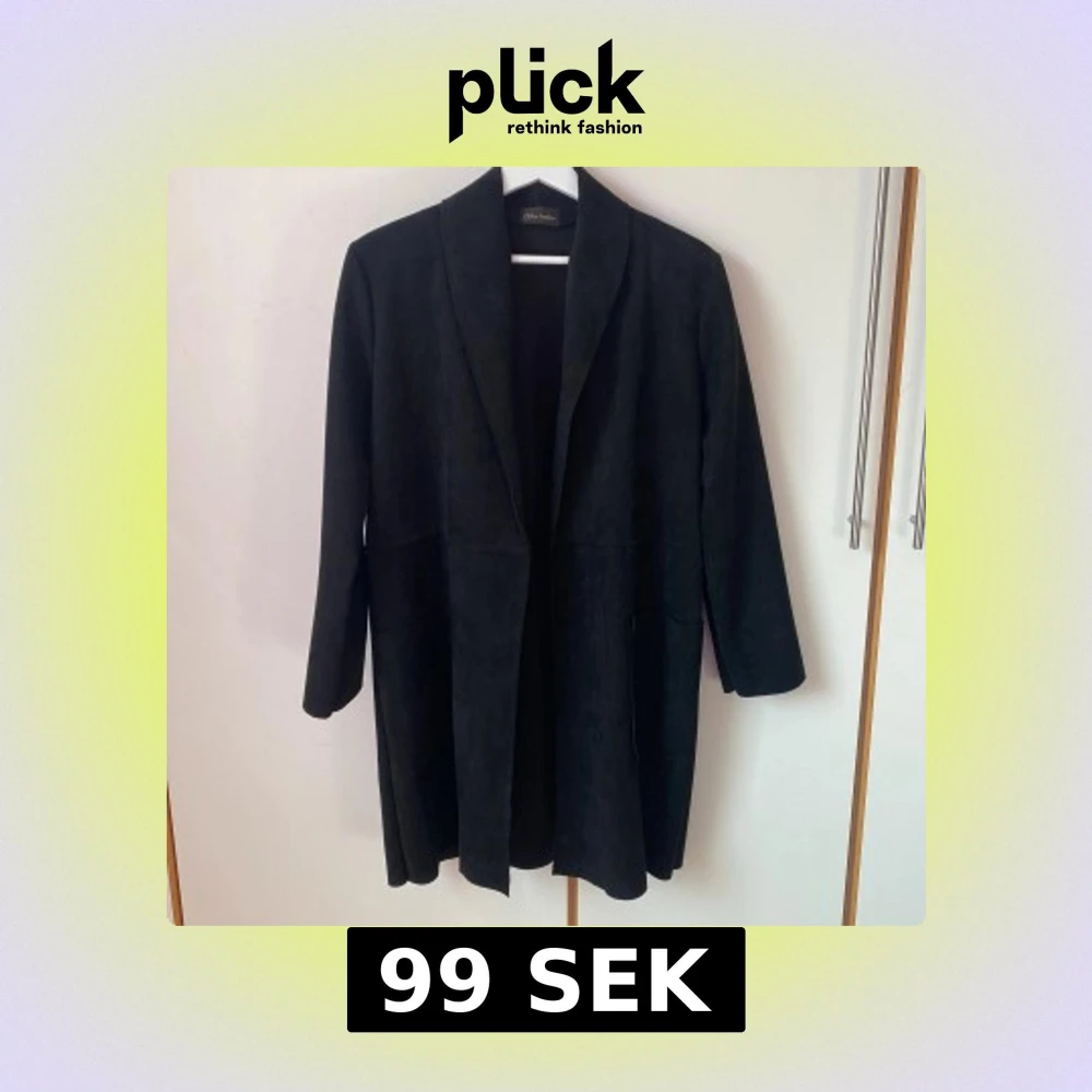 Elegant svart kavaj från Chica London. Öppen och rak modell utan knappar eller dragkedja. Tillverkad i ett mjukt mockaliknande material. Stora rymliga fickor. Längd 90 cm, axelbredd 43. Saknar storleksmärkning men är ca M/L.