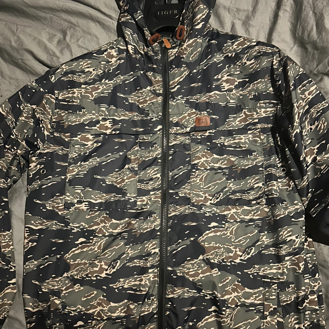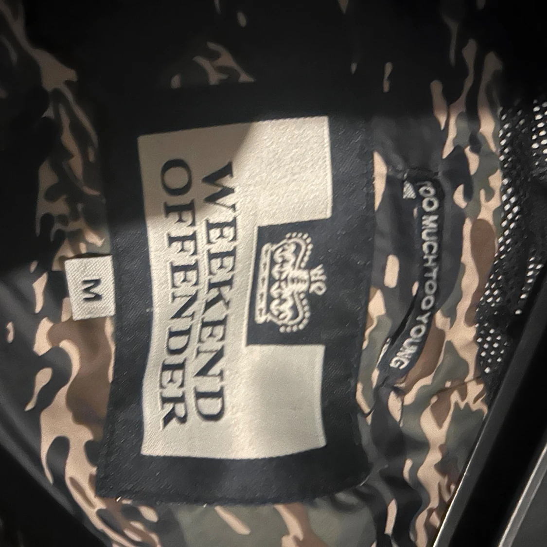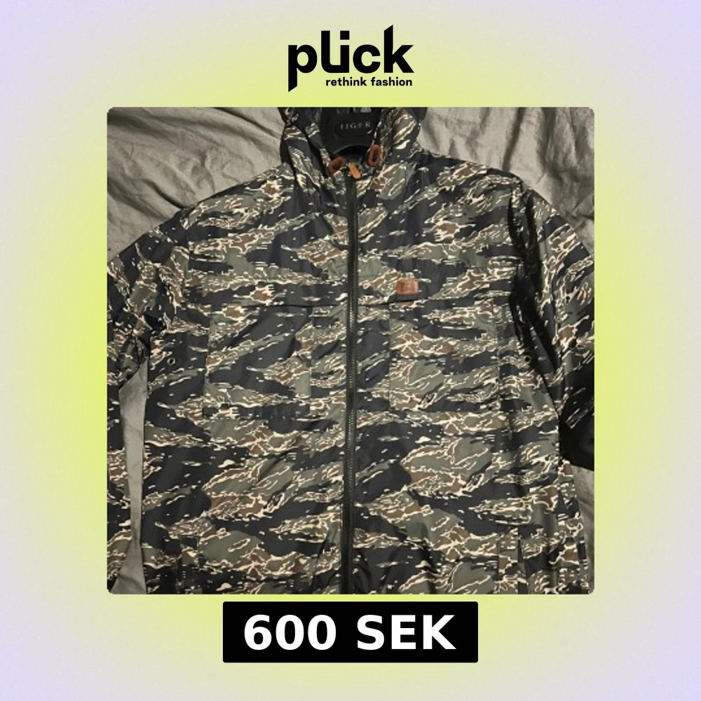 Säljer en snygg vindjacka från Weekend Offender i camouflage-mönster med dragkedja framtill och huva. Jackan har flera praktiska fickor och coola detaljer som bruna snöröglor vid halsen. Perfekt för dig som vill sticka ut med streetstyle. Iconiskt och köpt i London