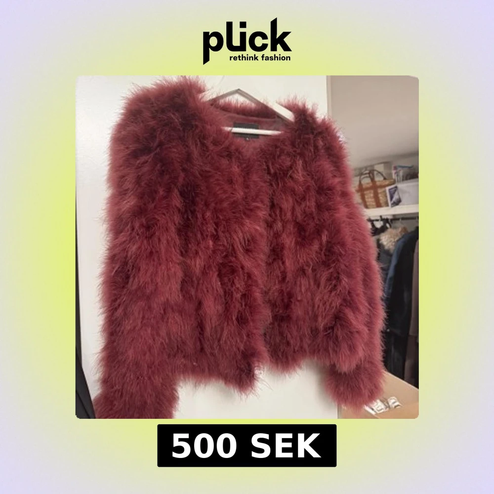 Säljer en vinröd pälsjacka med fluffig och lyxig känsla. Jackan har en croppad passform och är perfekt för dig som vill sticka ut. Den är långärmad och har en rund halsringning. Superfin att styla till olika outfits! Jackan är köpt från Hollies och det är äkta päls på den.