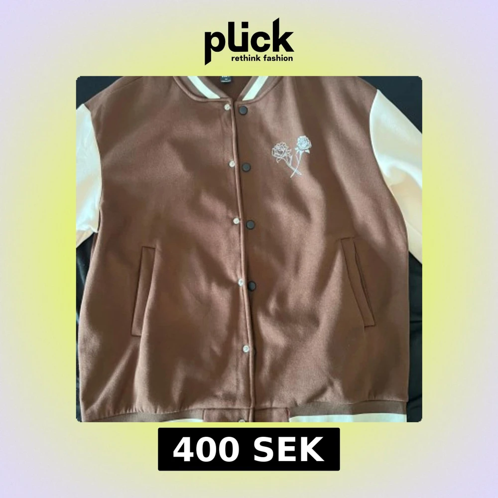 Säljer en brun och vit varsityjacka från Tworopes med tryckta rosor på bröstet och logga på ärmen. Jackan har knappar framtill, två fickor och kontrastfärgade ärmar. Perfekt för dig som gillar streetwear och snygga detaljer.