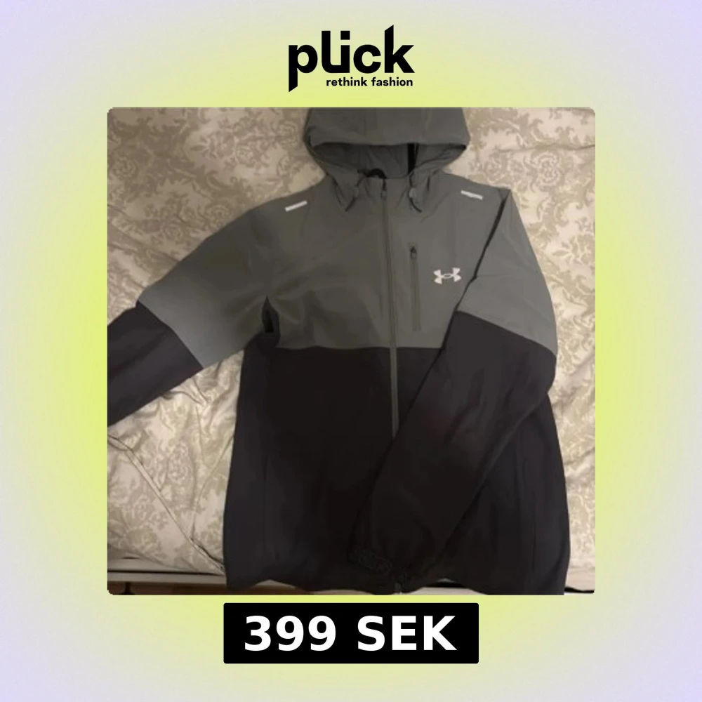 Säljer en snygg grå och svart jacka från Under Armour. Jackan har en dragkedja framtill och en huva för extra skydd. Perfekt för kyligare dagar med sin stilrena design och funktionella detaljer.