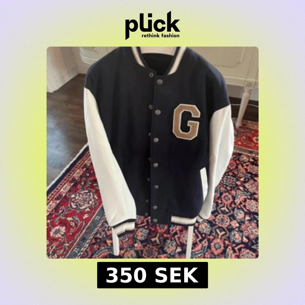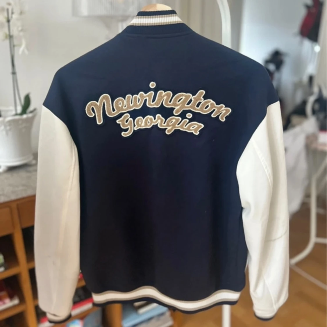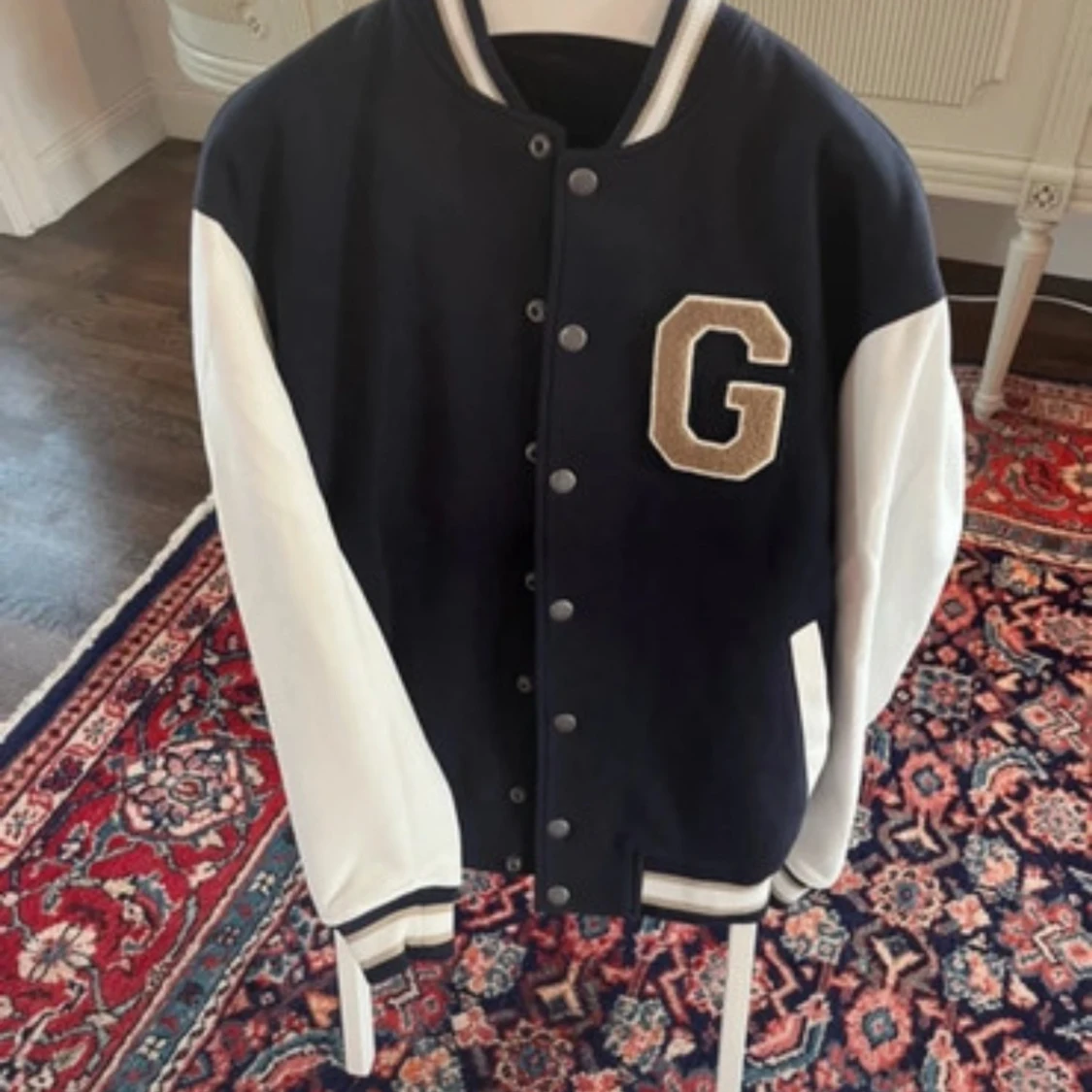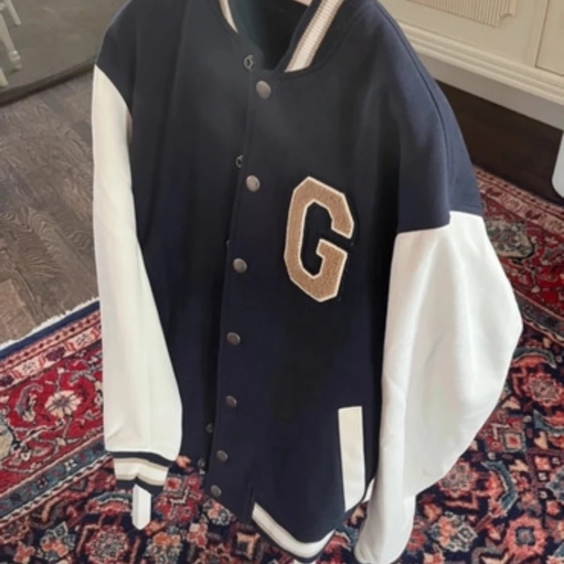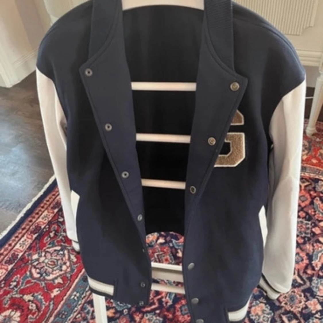 Snygg bomberjacka i blått och vitt. Jackan har knappar framtill och ribbade muddar vid ärmslut och nederkant. Perfekt för en cool och avslappnad stil.