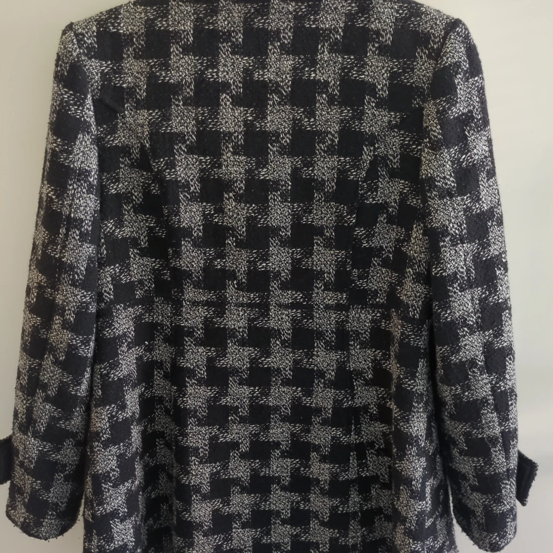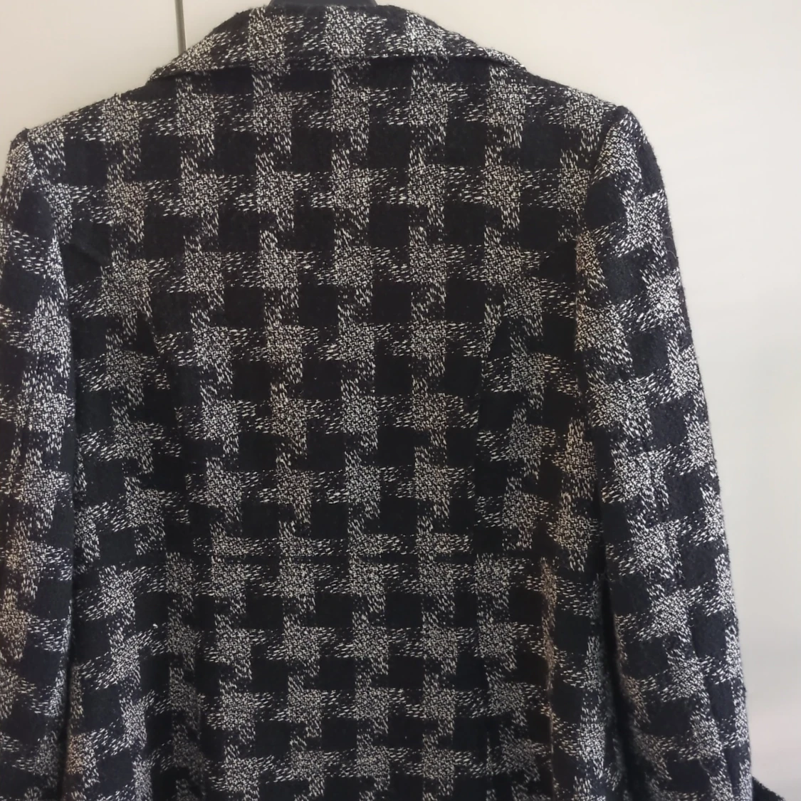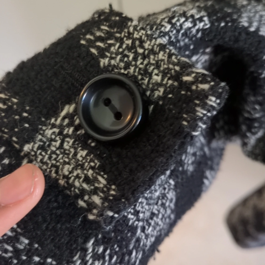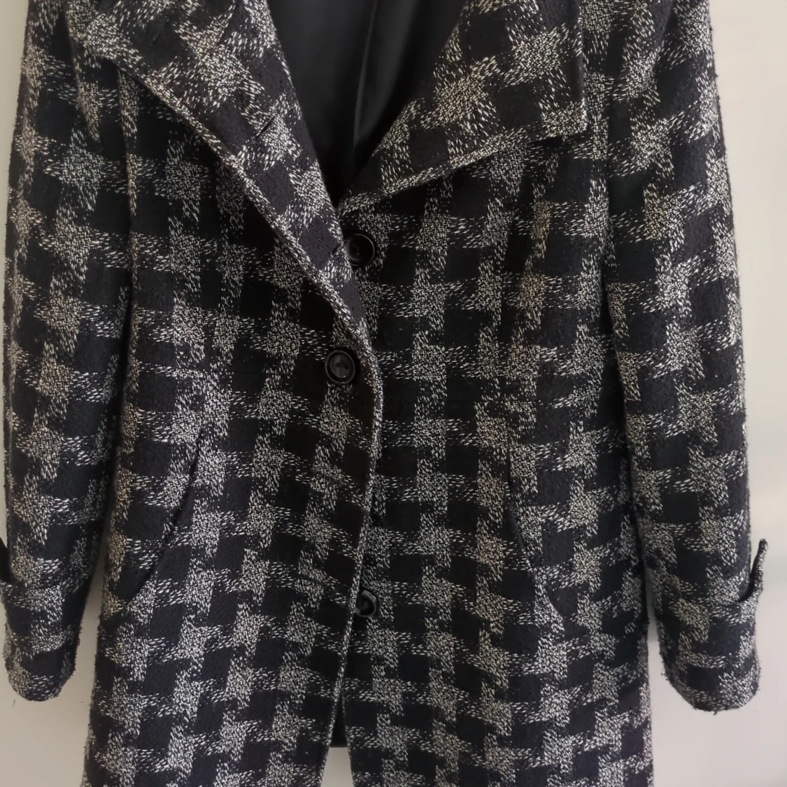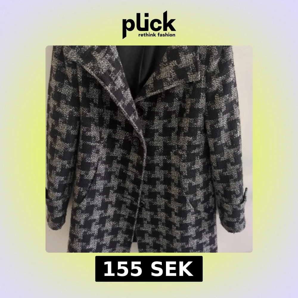Snygg kappa i svart och vitt med rutigt mönster och stora knappar framtill. Jackan har bred krage, långa ärmar och är tillverkad i ett grovt tyg som känns både stilrent och trendigt. Perfekt för dig som vill sticka ut med ett klassiskt men edgy plagg.