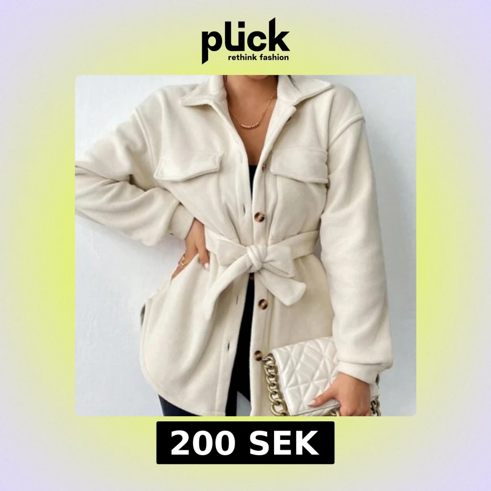 Stilren beige overshirt med knappar framtill, två bröstfickor och ett brett bälte i midjan som knyts. Jackan har lång ärm. Kostade 330