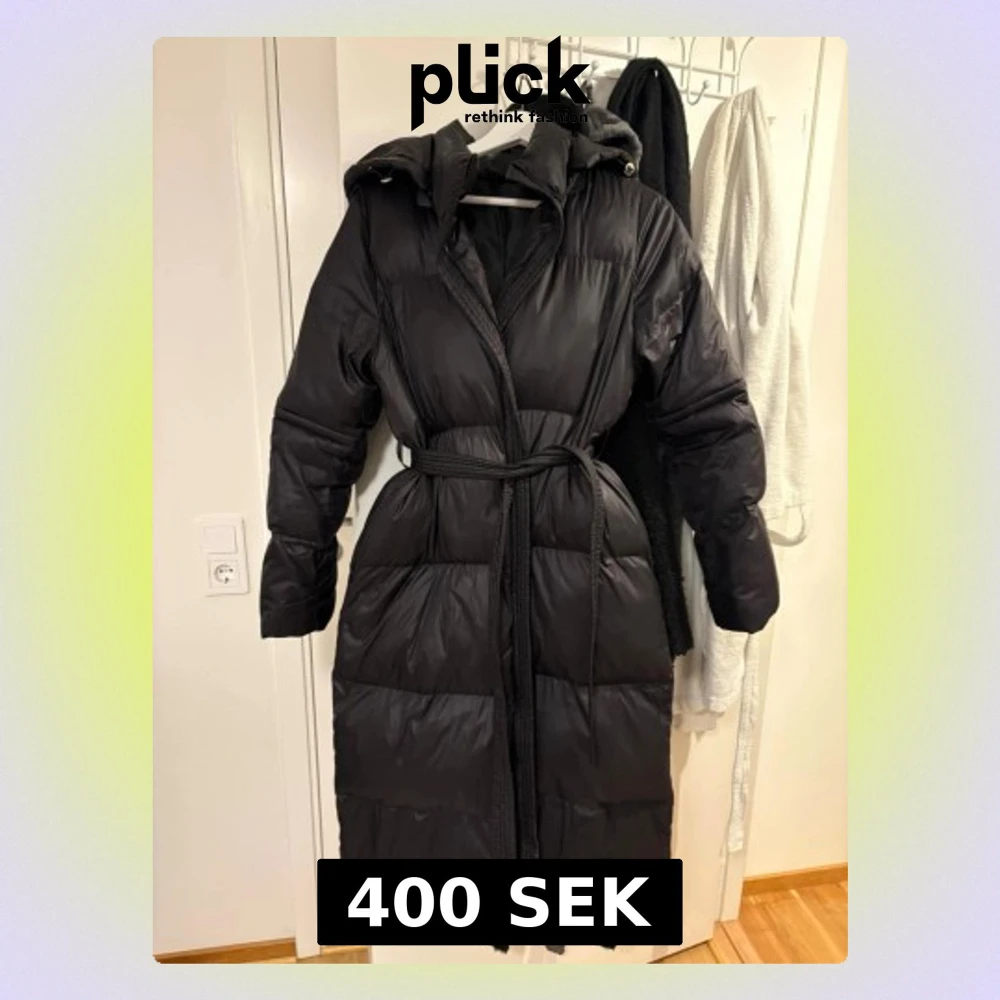 Säljer en svart lång pufferjacka med huva och bälte i midjan. Jackan har en quiltad design och är perfekt för kalla dagar. Den har långa ärmar och en oversized look som ger en riktigt skön vibe. Passar dig som vill hålla dig varm och snygg i vinter.