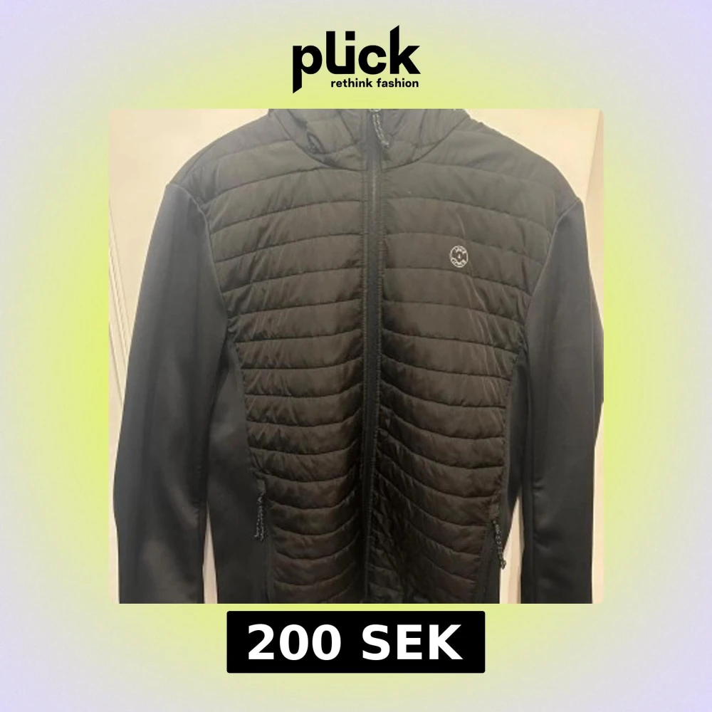 Snygg svart jacka med quiltad design och huva. Jackan har dragkedja framtill och ett stilrent märke på bröstet.