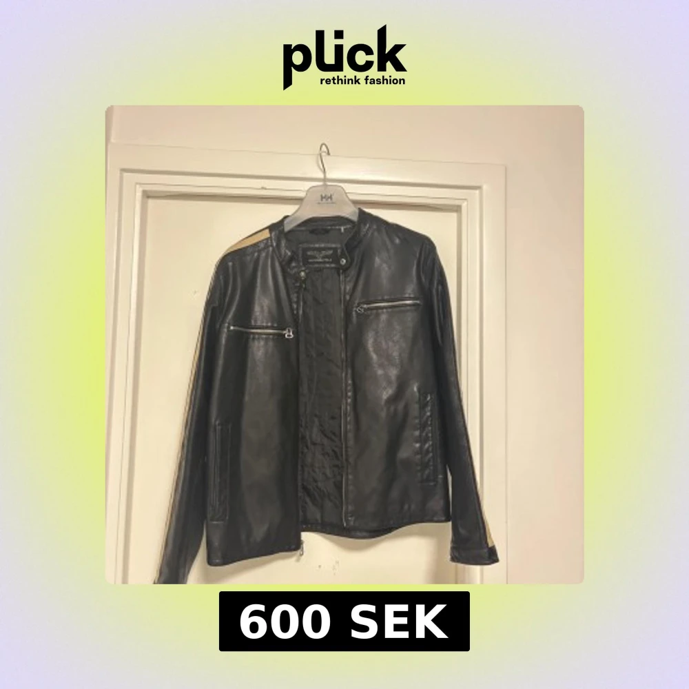 Snygg svart skinnjacka från Wilsons Cycle med dragkedja och coola detaljer. Jackan har långa ärmar med ränder i beige och orange längs sidorna. Perfekt för en stilren look. Äkta läder!!
