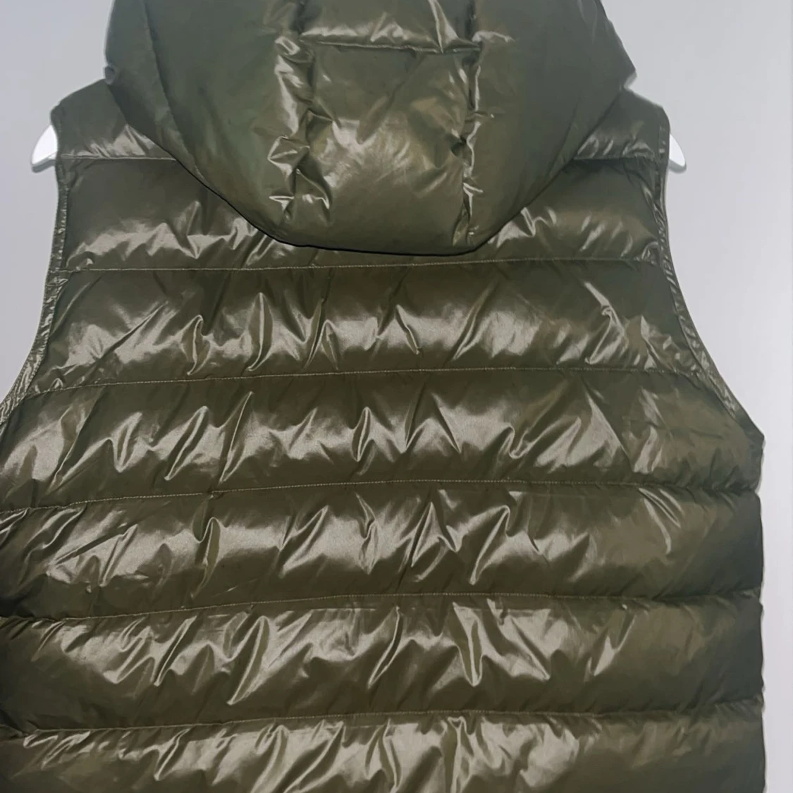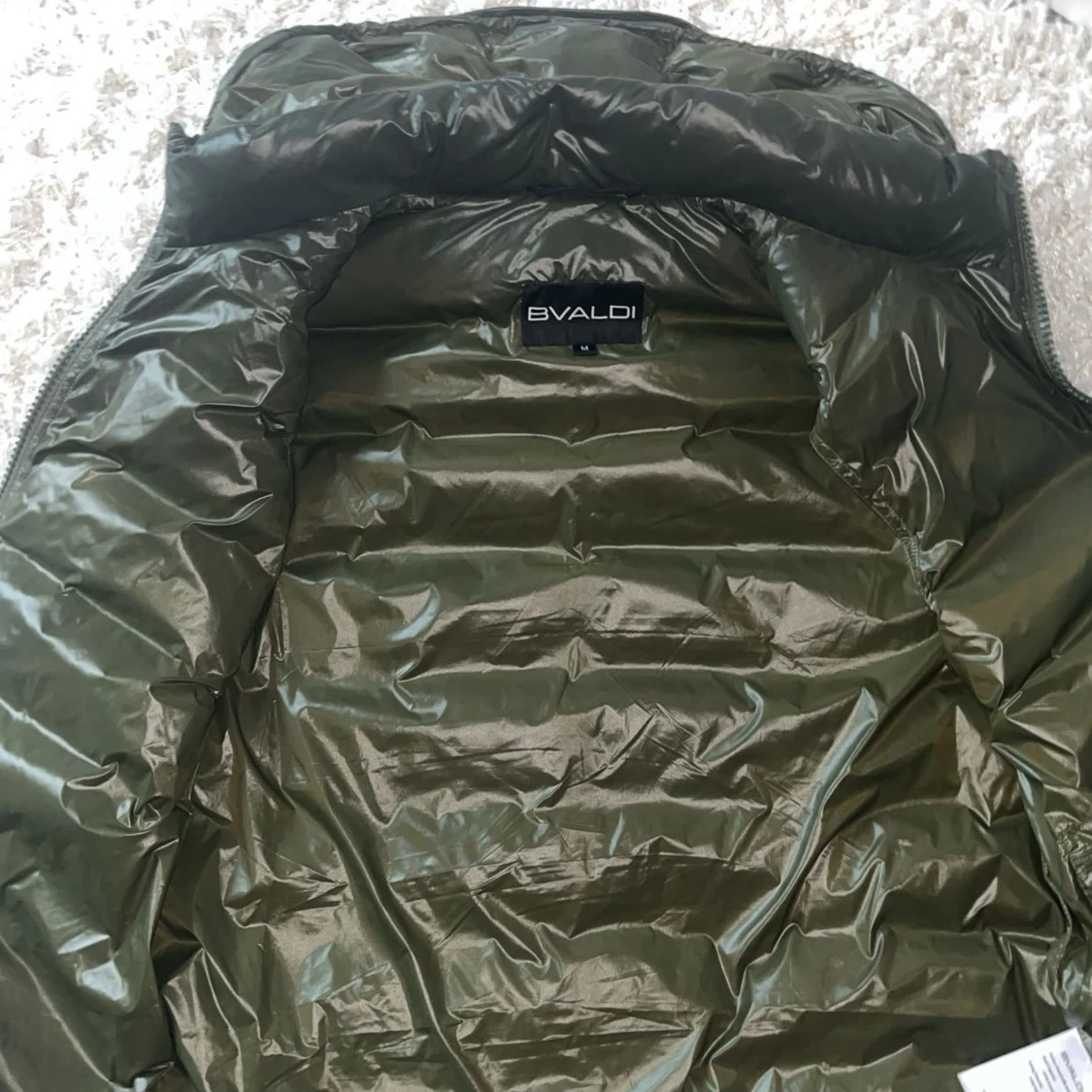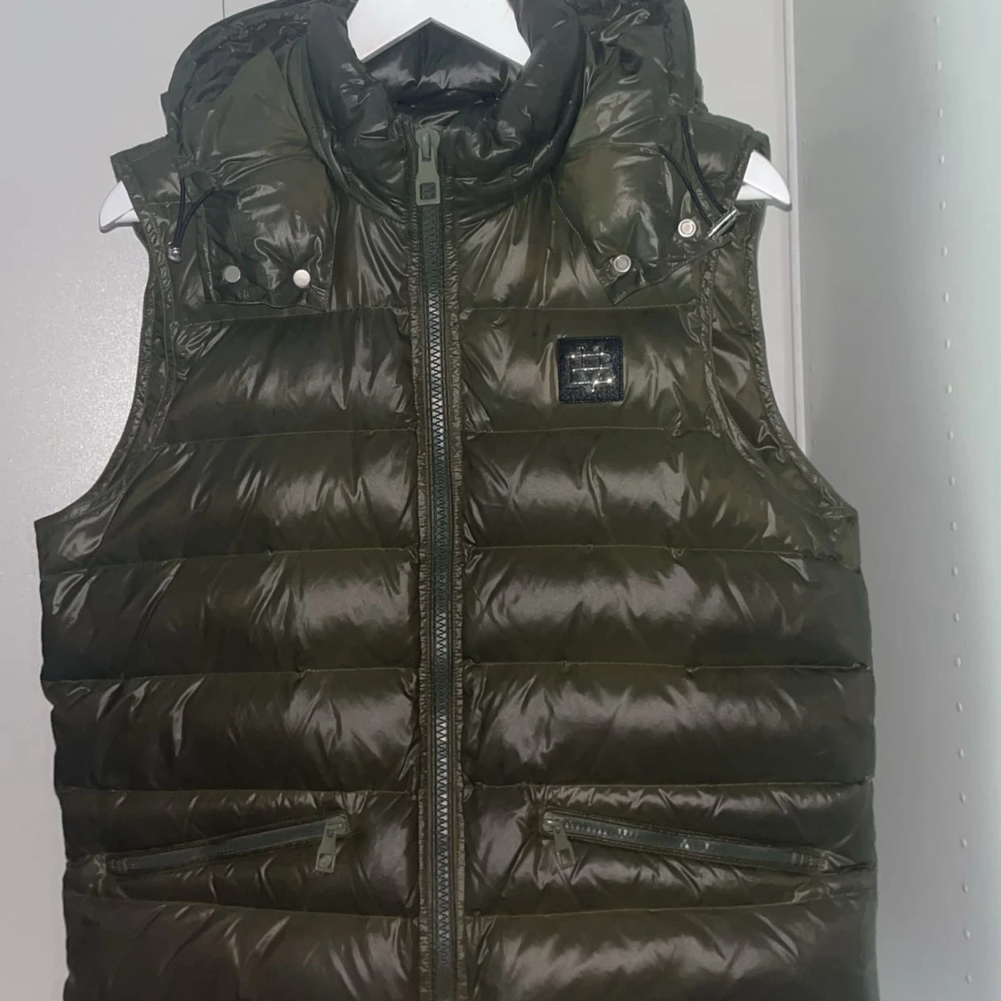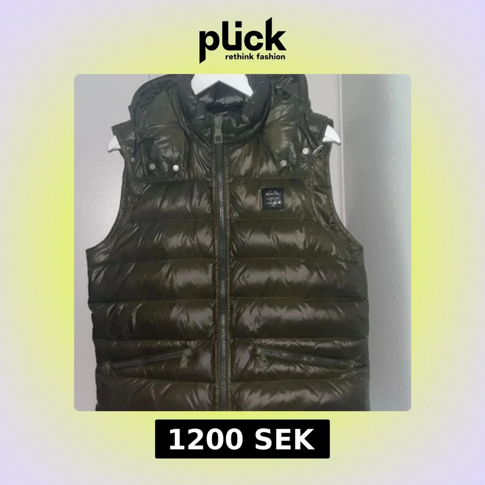 Snygg olivgrön dunväst från Bvaldi med hög krage och avtagbar huva. Västen har två dragkedjefickor framtill och quiltad design. Perfekt att slänga över en hoodie för en chill look. Stängs med dragkedja hela vägen upp.