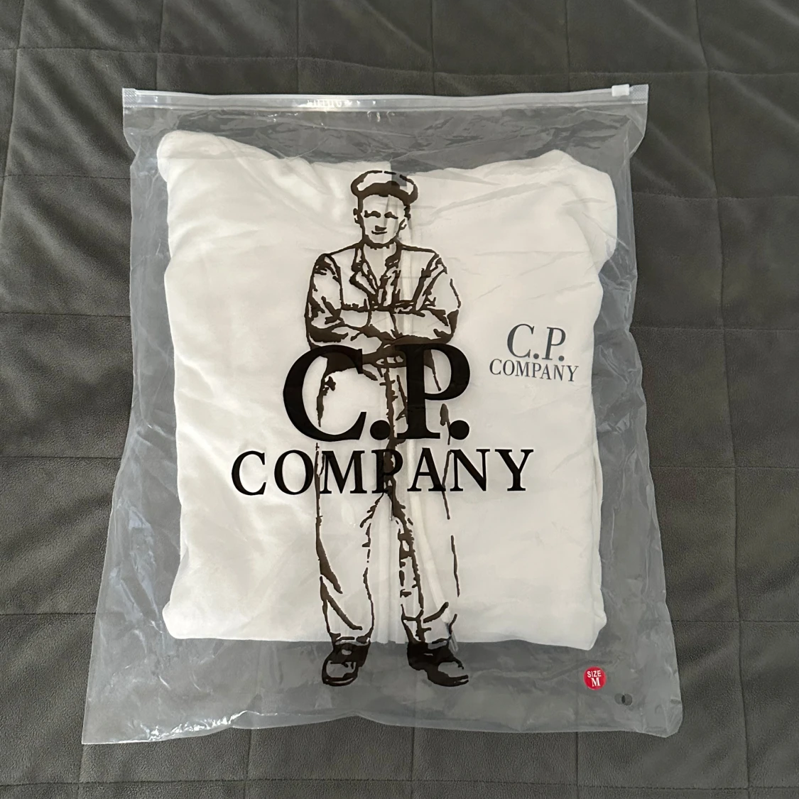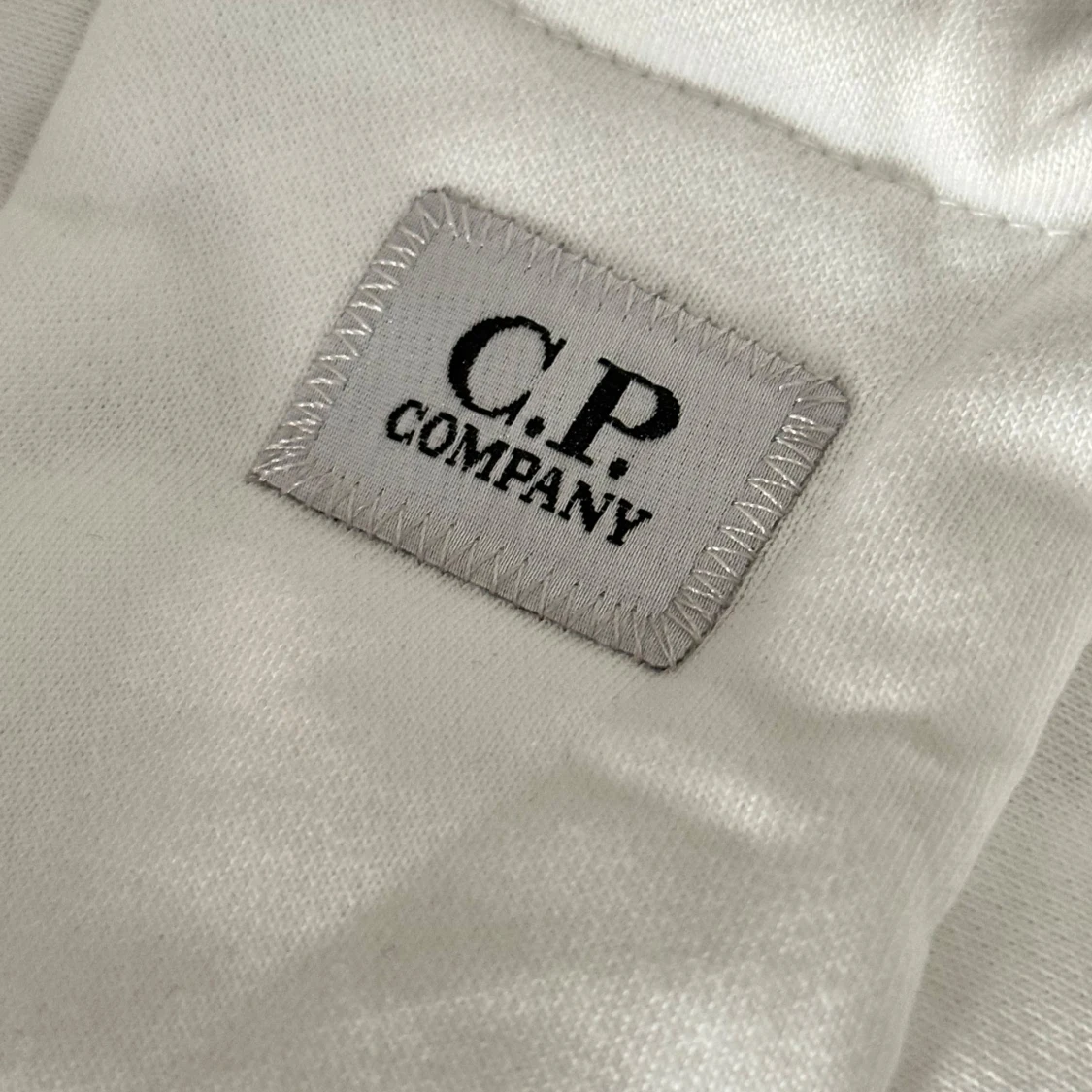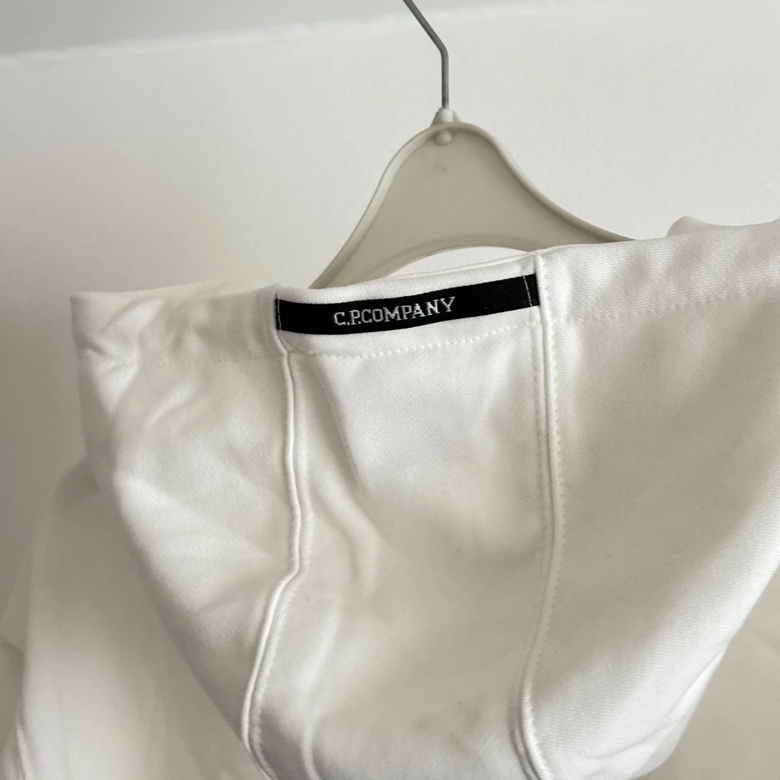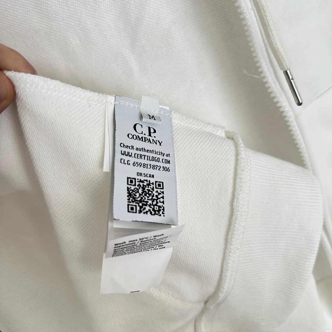 Vit hoodiejacka från C.P. Company med dragkedja framtill, två fickor och ikonisk linsdetalj på ärmen. Passar även för dem som har Storlek S men i rätt kroppsform