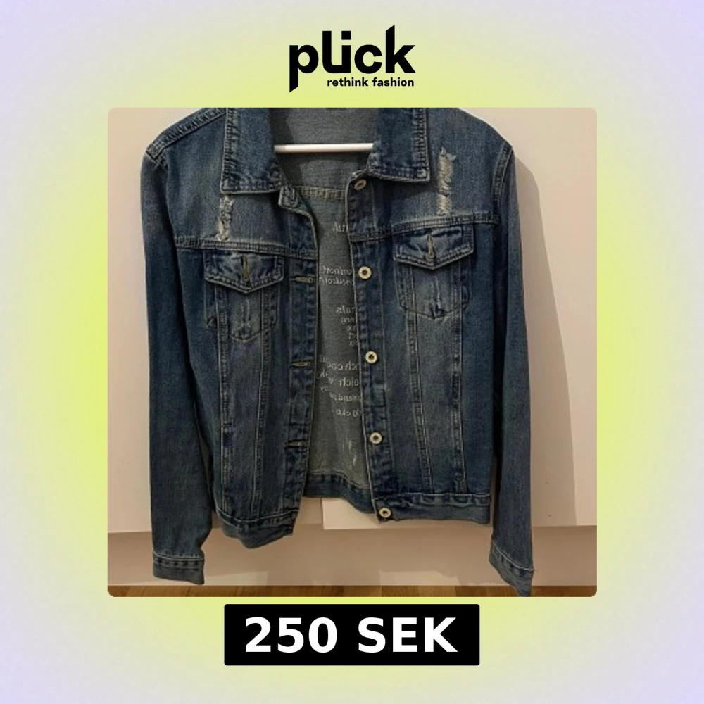 Snygg blå jeansjacka med slitna detaljer och broderad text på ryggen. Klassisk modell med bröstfickor och knappar framtill. Jackan har en cool vintagekänsla och passar perfekt till streetwear-stilen.