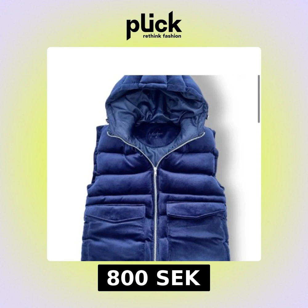 Snygg blå quiltad dunväst med dragkedja och praktisk huva. Västen har två fickor framtill för extra förvaring. 10/10 helt ny