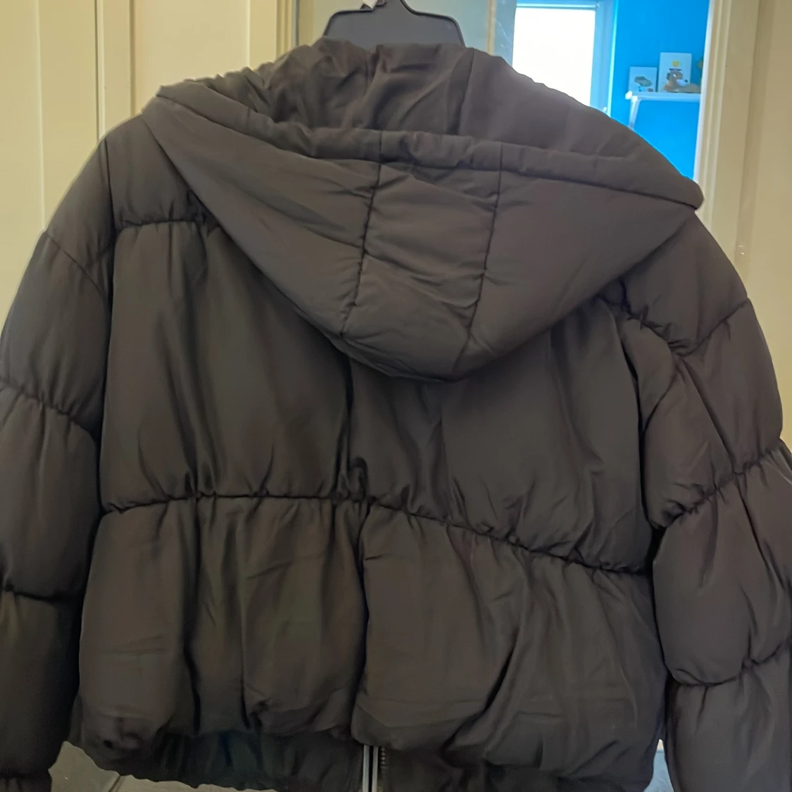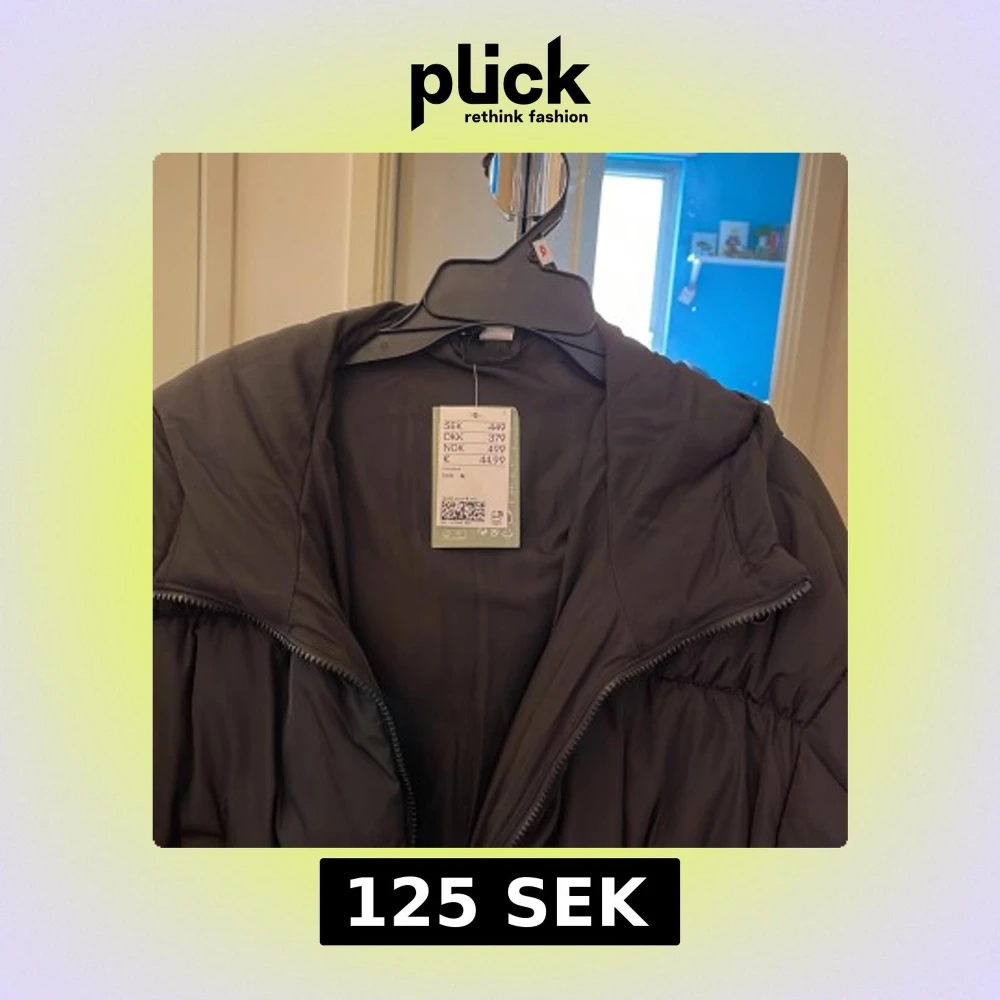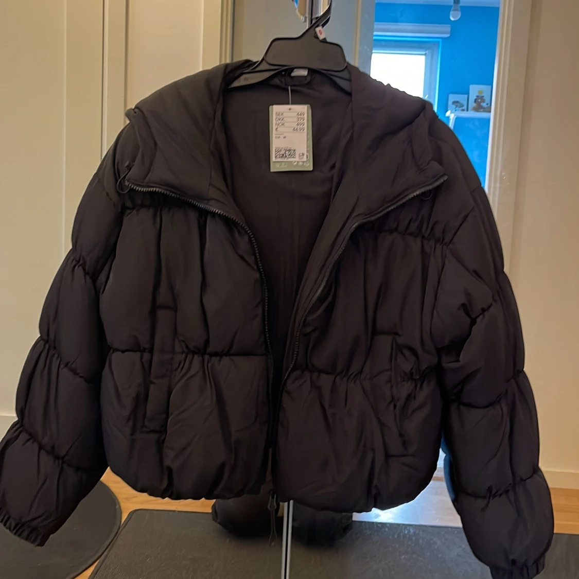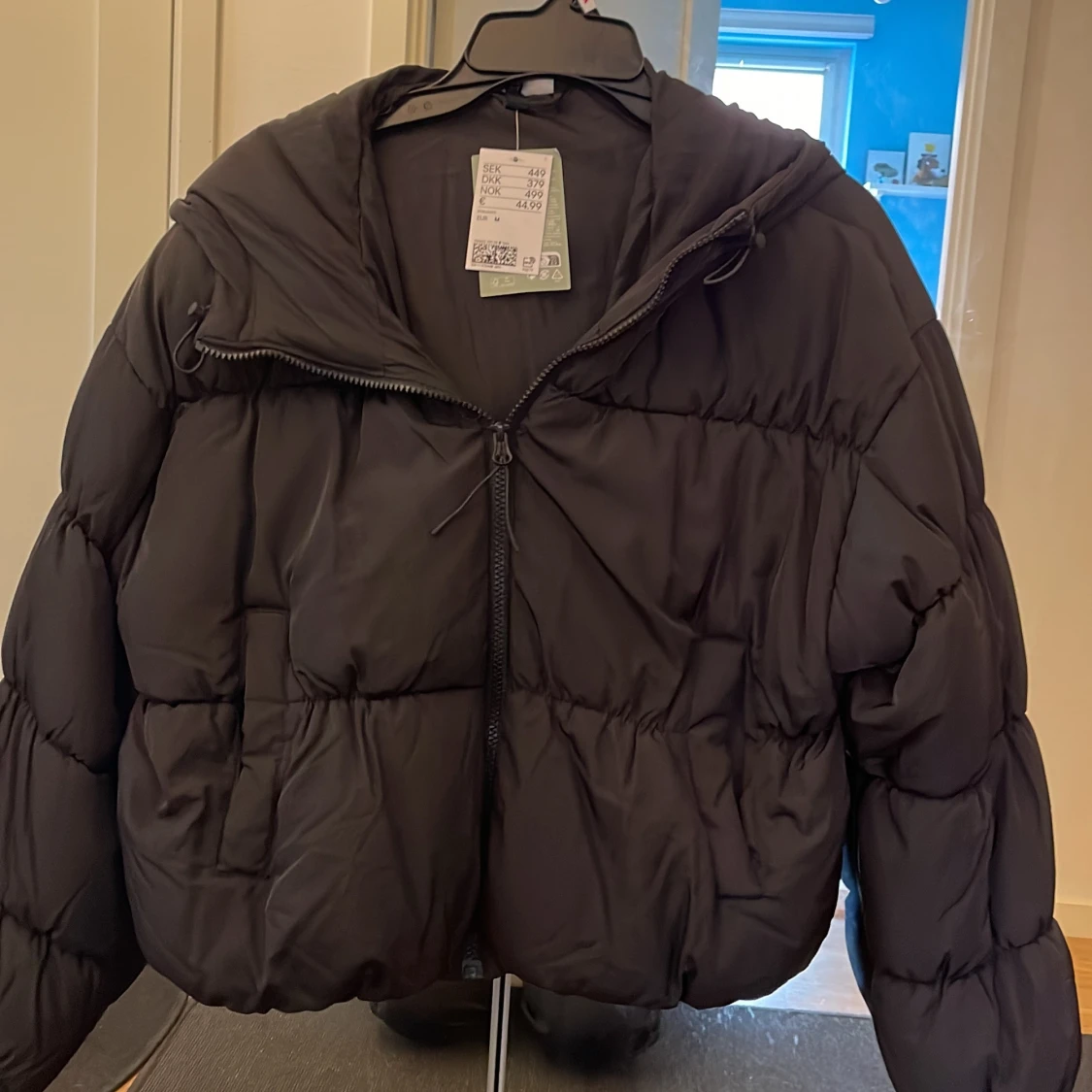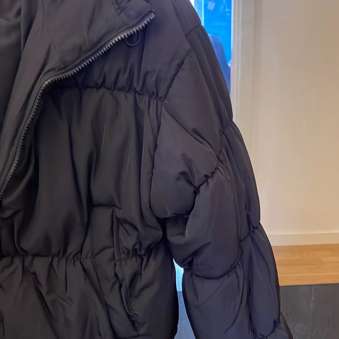 Säljer en svart pufferjacka i storlek M med stor huva och dragkedja framtill. Jackan har en oversized look med breda, quiltade sektioner och elastiska muddar vid ärmslut. Perfekt för kalla dagar när du vill ha en chill och trendig stil.