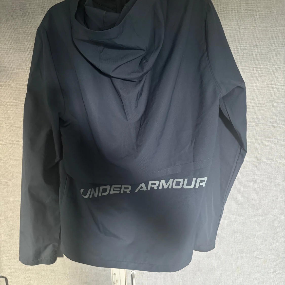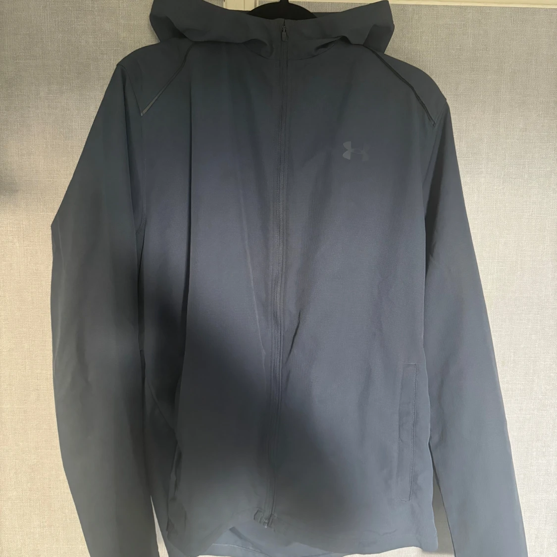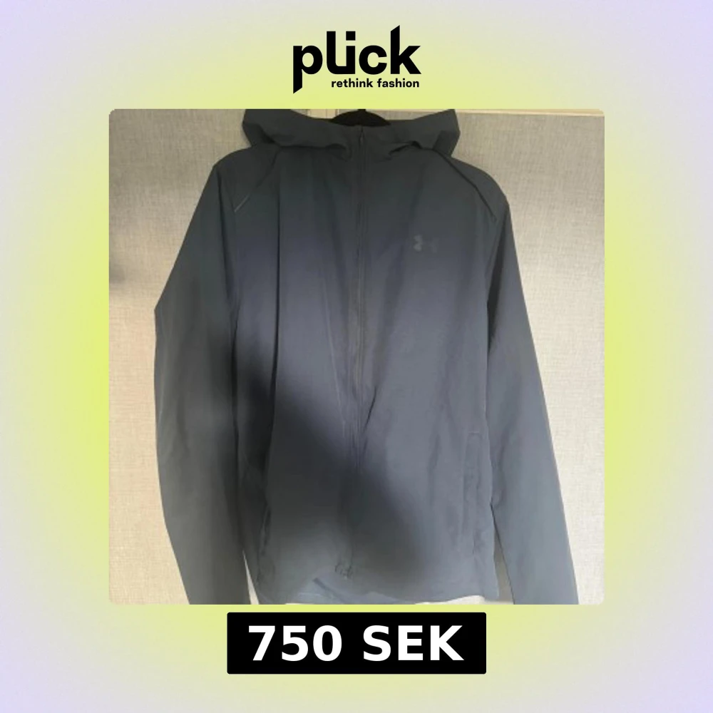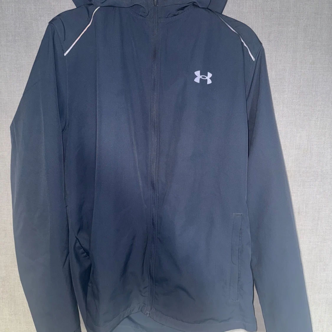 Säljer en blå vindjacka från Under Armour med huva och dragkedja framtill. Strl M sällsynt modell hör av er vid frågor