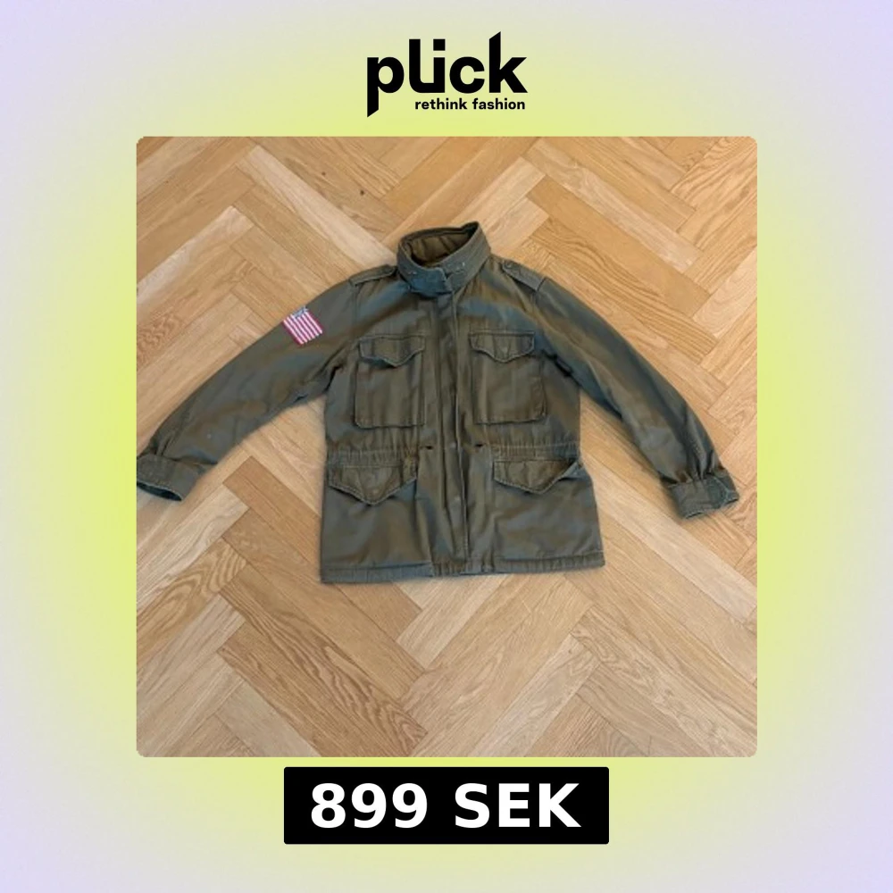 Säljer en olivgrön parkajacka från Ralph Lauren med amerikansk flaggpatch på ärmen. Jackan har fyra stora fickor framtill, hög krage och dragkedja med knappslå. Materialet är slitstark bomull och jackan är långärmad med justerbara muddar.