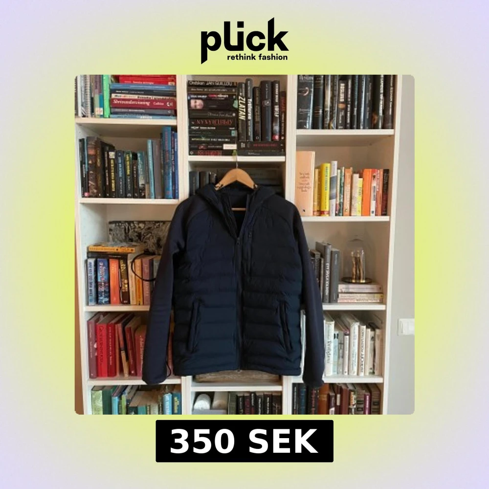 Snygg mörkblå pufferjacka med huva och dragkedja framtill. Jackan har quiltad framsida och baksida, samt släta ärmar. Perfekt för kyliga dagar och har en stilren look som funkar till det mesta. En enkel hybrid jacka helt enkelt. Storlks sägs inte i jackan men är M