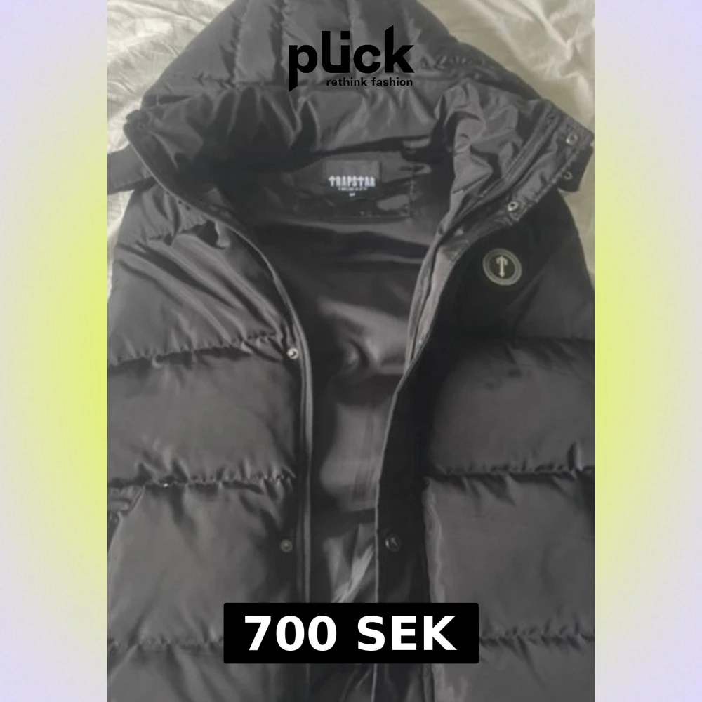 Svart puffervest från Trapstar med stor huva och broderad logga på ryggen. Jackan har tryckknappar med logotyp, dragkedja och ett runt Trapstar-märke på bröstet. Materialet är glansig polyester och jackan är vadderad för extra värme. (Om bilderna ser zoomade ut eller skumma så är det för jag screenshotat från mitt konto på vinted)
