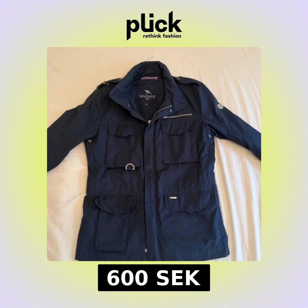 Säljer en mörkblå jacka från Snoot med flera stora fickor framtill, dragkedja och snygga detaljer i metall. Jackan har klassisk krage, långa ärmar och är tillverkad i ett slitstarkt polyestertyg. Perfekt för dig som gillar stilren och funktionell design.