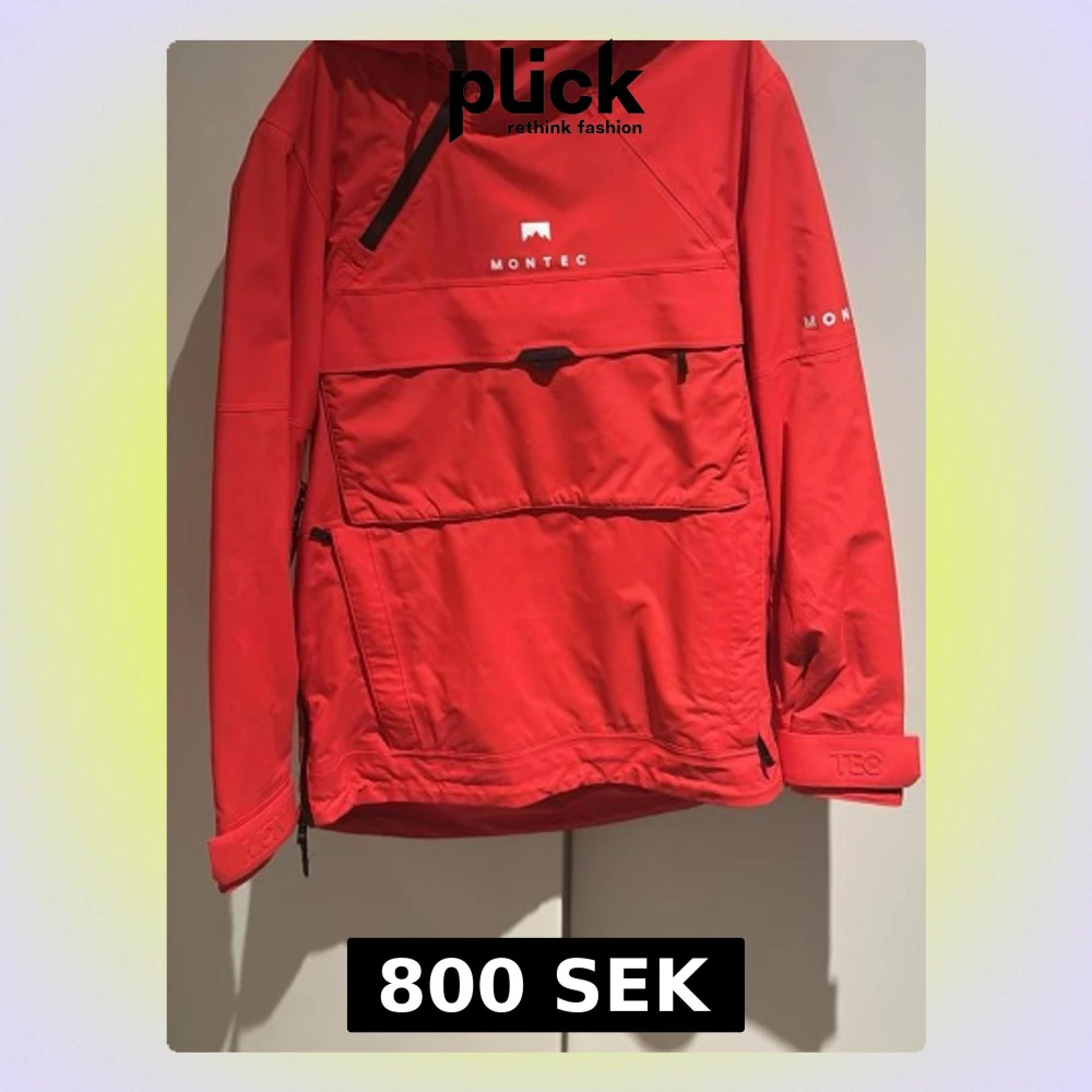 Säljer en röd vindjacka från Montec med stor magficka, huva och dragkedjor på sidan och framtill. Perfekt skidjacka! Endast använd 1 vecka.
