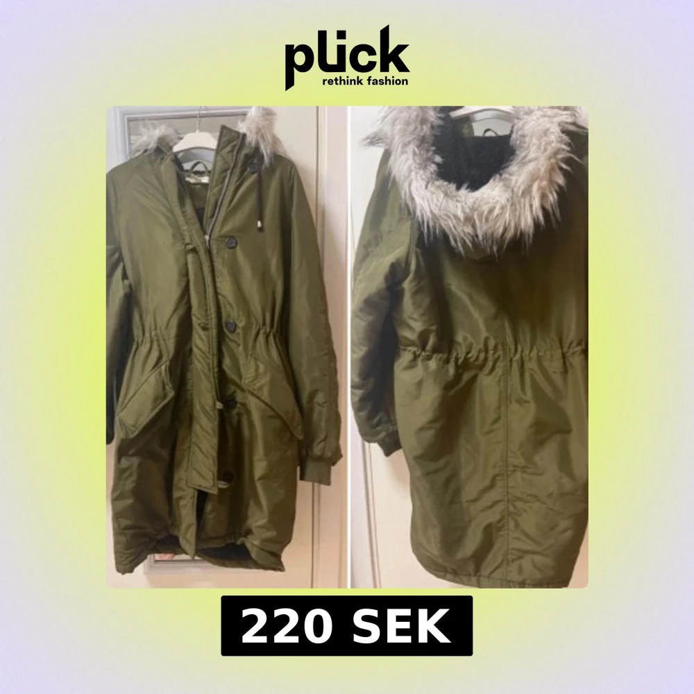 Säljer en olivgrön parkajacka med huva och fuskpälsdetalj. Jackan har knappar, dragkedja och snörning i midjan för snygg passform. Långa ärmar med muddar och stora fickor framtill. Perfekt för kyliga dagar.