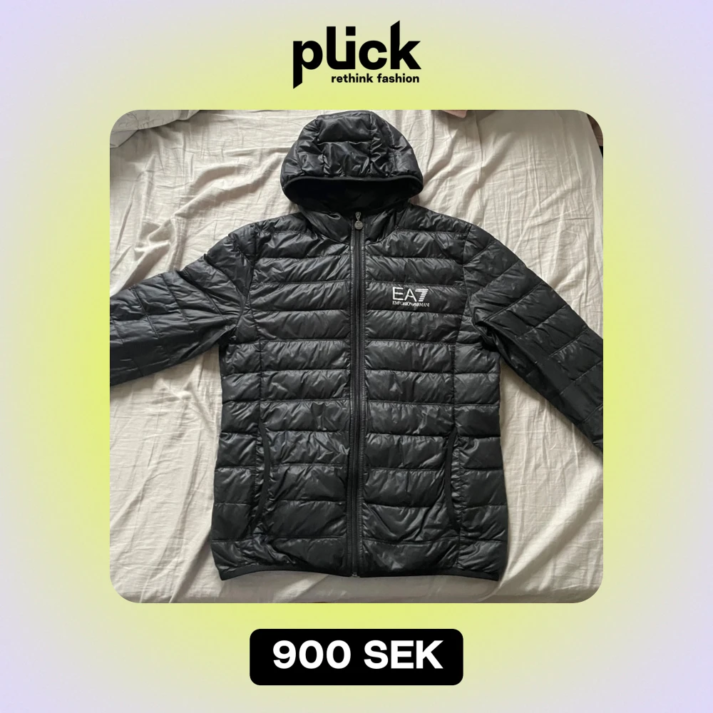 Säljer en snygg svart pufferjacka från Emporio Armani EA7. Jackan har en dragkedja framtill och en huva för extra skydd mot väder. Perfekt för kyliga dagar och har en stilren design med märkets logga på bröstet.