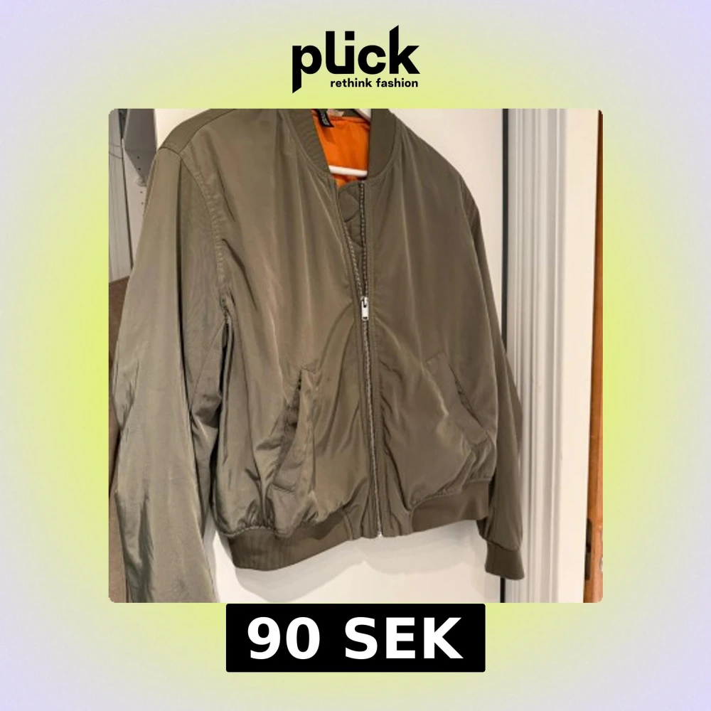 🌸Snygg olivgrön bomberjacka med klassisk passform och orange foder. Jackan har dragkedja framtill, två snedställda fickor och ribbade muddar vid ärmslut och midja 🌸