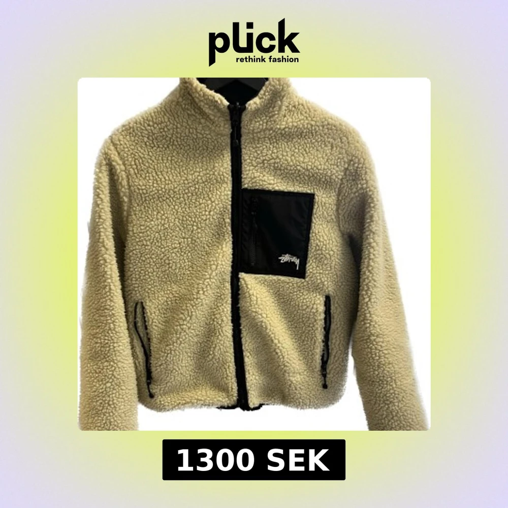 Teddyjacka från Stussy i beige och svart med dragkedja framtill, svart bröstficka med logga och två sidofickor. Baksidan har en stor svart panel med en vit 8-boll. Jackan har hög krage och är fodrad för extra värme.