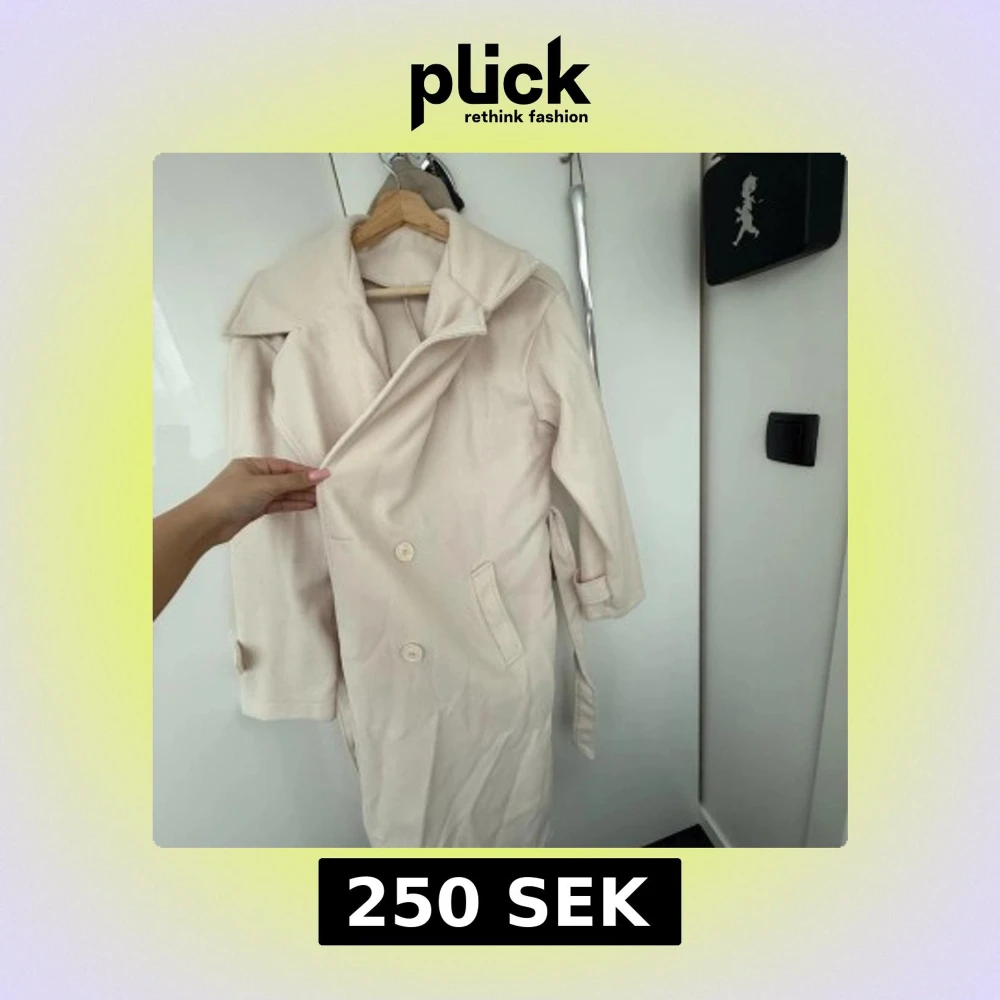 Säljer en stilren beige kappa med bälte och stora slag. Den har långa ärmar med dekorativa knappar vid ärmsluten och knäppning framtill. Perfekt för kyligare dagar!