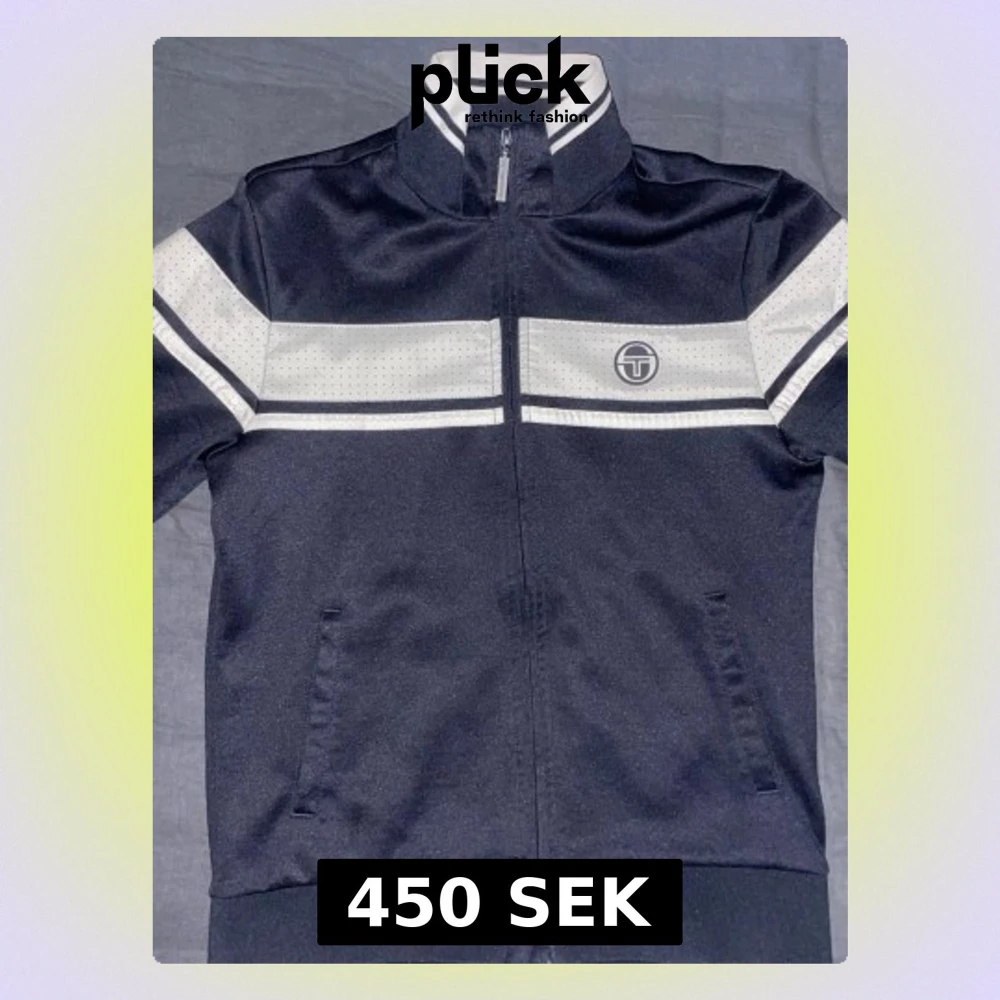 Sportig svart vindjacka från Sergio Tacchini med vita ränder och perforerade detaljer över bröst och ärmar. Jackan har hög krage, dragkedja framtill och två sidofickor. Perfekt för en streetwear-look.