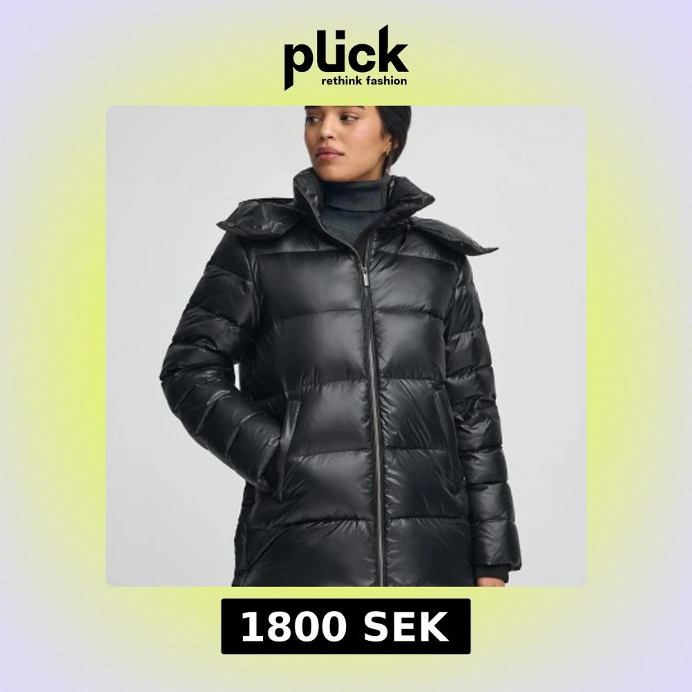 Svart pufferjacka med hög krage och stor huva. Jackan har quiltad design, dragkedja framtill och två sidofickor. Materialet är glansigt och syntetiskt, vilket ger en modern vibe. Perfekt för kalla dagar och har en loose passform som gör den extra bekväm.