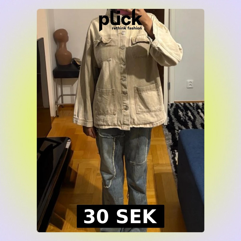 Säljer en beige oversized jeansjacka med stora fickor fram och knappstängning. Jackan har klassisk krage, raka ärmar och coola sömdetaljer. Perfekt för dig som gillar en avslappnad och trendig stil.