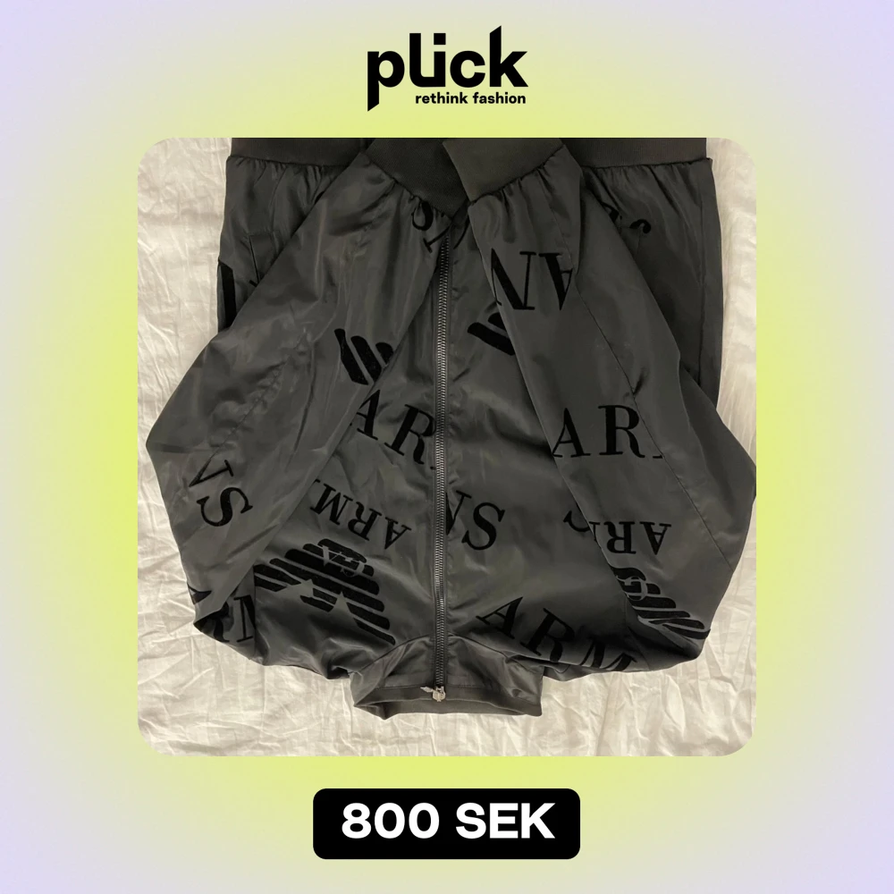 Snygg svart bomberjacka från Emporio Armani med stora logotyper och dragkedja framtill. Perfekt för en stilren look.