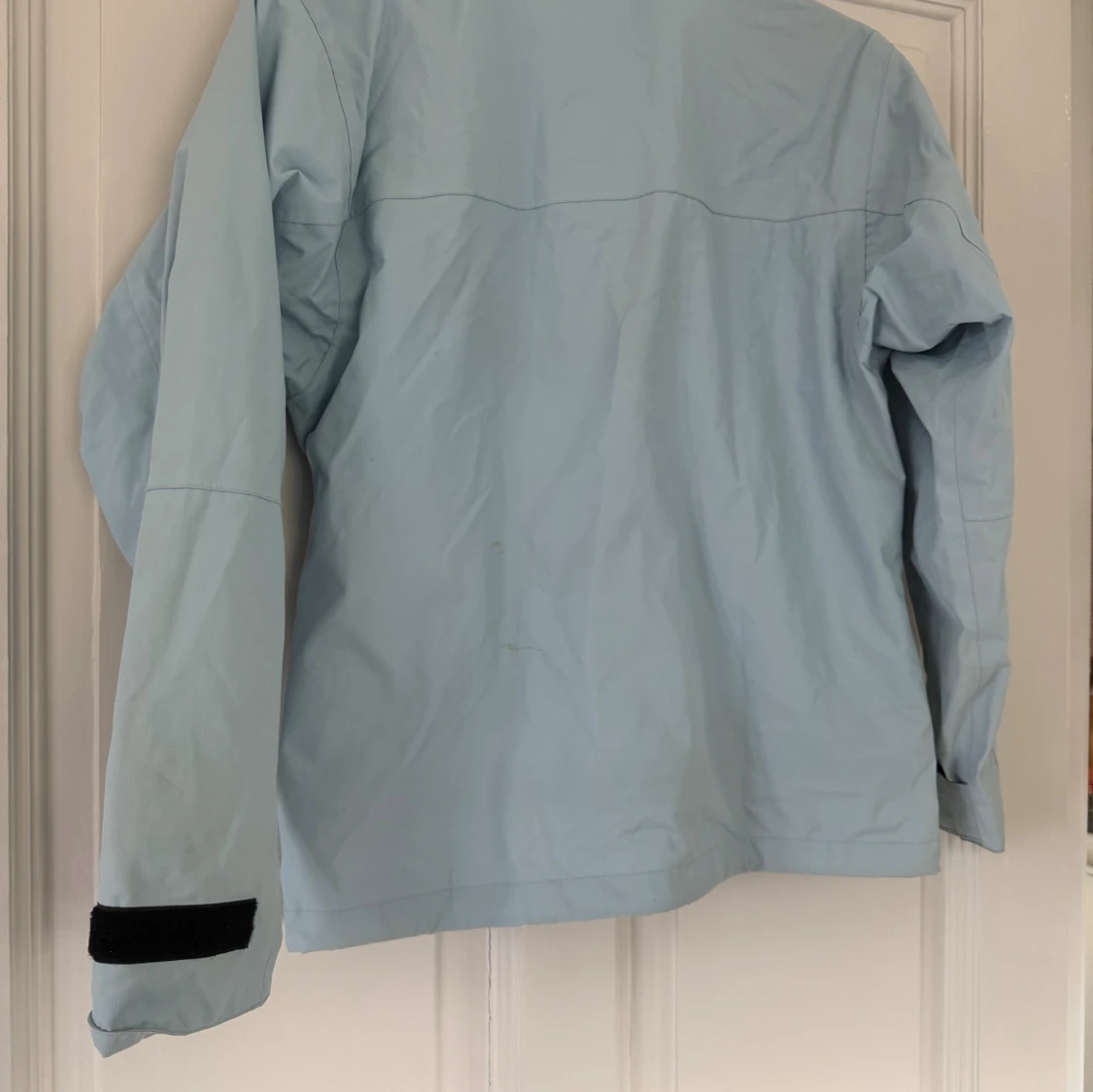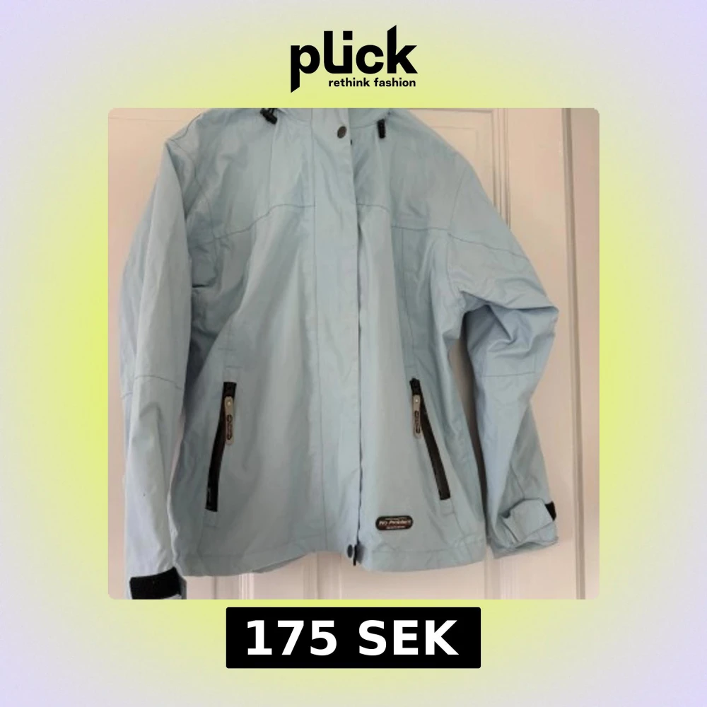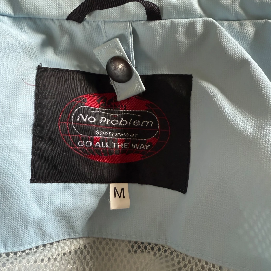 Ljusblå vindjacka från No Problem Sportswear i storlek M. Jackan har svarta dragkedjor på fickorna, hög krage och justerbara ärmslut med kardborre. Tillverkad i polyester med PU-coating och meshfoder i nylon. Perfekt för blåsiga dagar.