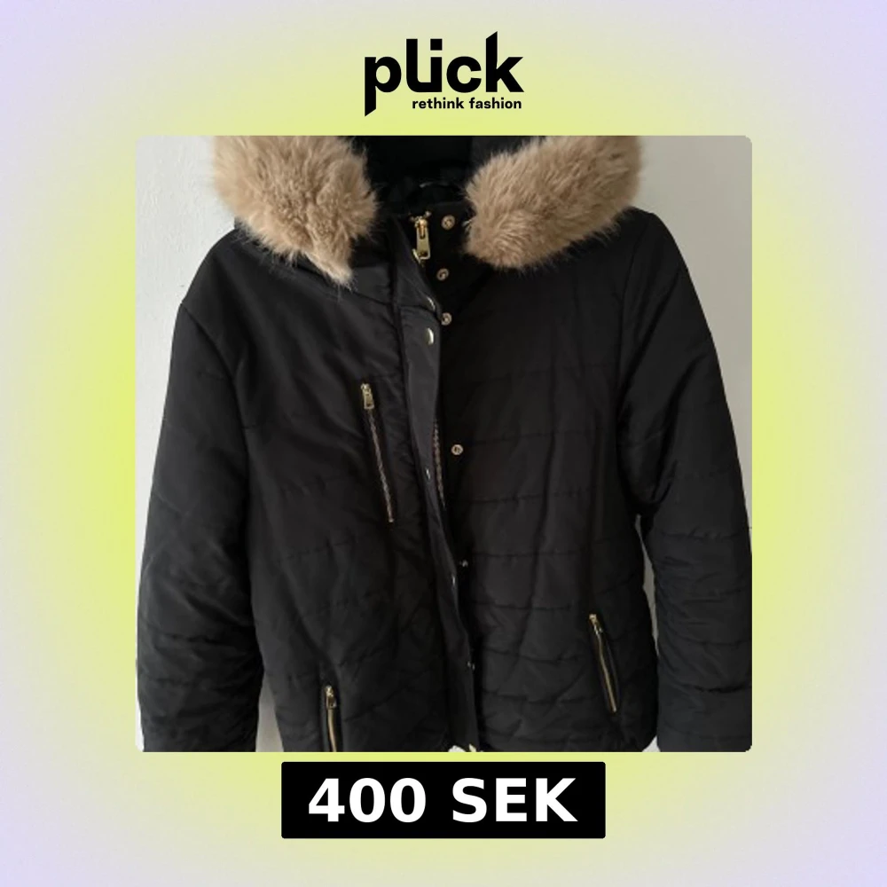 Svart vinterjacka med fuskpäls. Jackan har stl uk 12, tror det motsvarar en stl m.