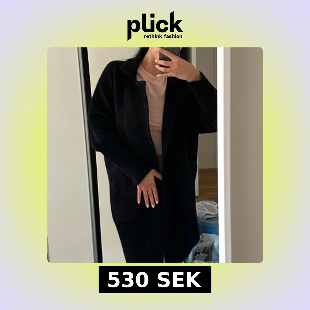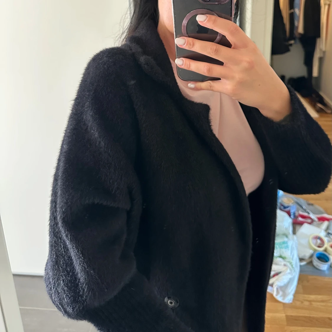 Lång svart alpacka kappa med krage och stora fickor framtill. Jackan har en oversized passform och stängs med en knapp. Mjuk och fluffig känsla, perfekt för kyligare dagar.