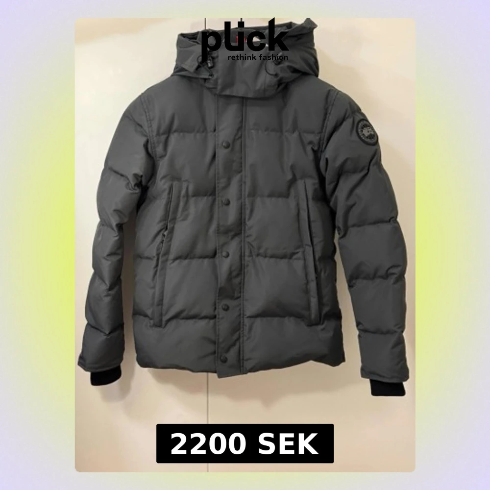Säljer en svart dunjacka från Canada goose med huva och snygga detaljer som snörning och dragkedja. Jackan har quiltad design, långärmade ärmar och två praktiska fickor med dragkedja. Perfekt för kalla dagar och har en cool patch på ärmen.