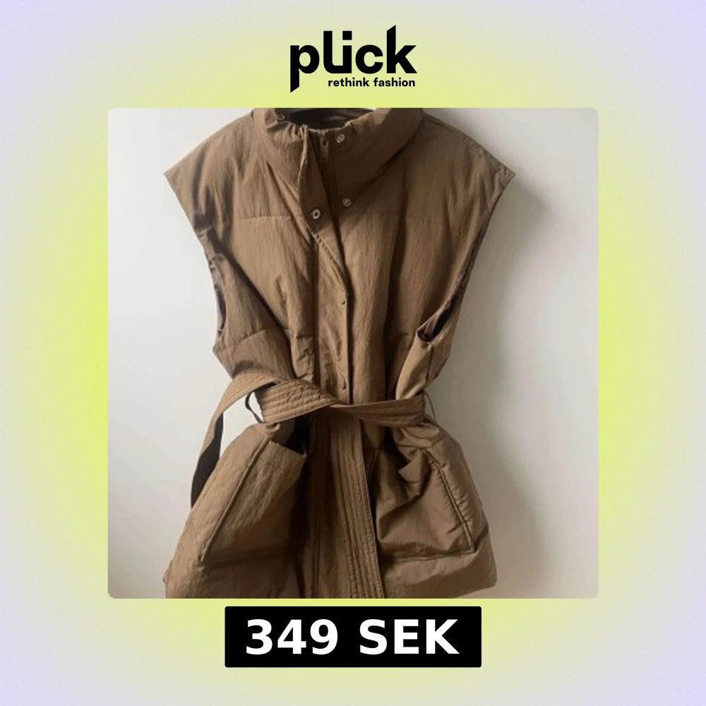 Säljer en snygg brun dunväst från Pieces. Västen har en hög krage och praktiska fickor framtill. Den stängs med både dragkedja och knappar och har ett bälte i midjan för en justerbar passform. Använd endast ett fåtal gånger, inga fläckar.