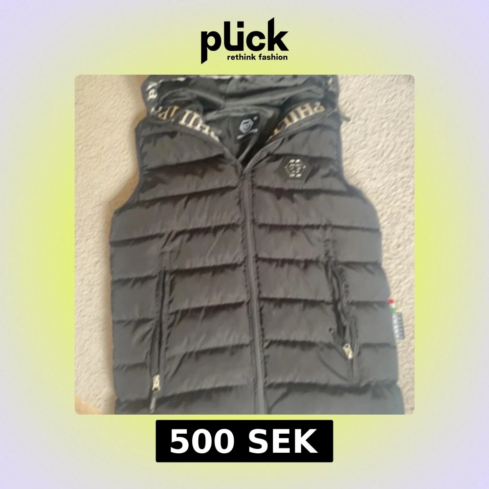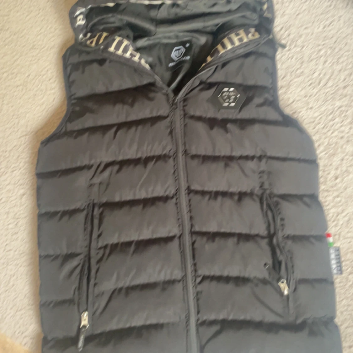 Snygg svart dunväst från Philipp Plein med quiltad design och dragkedja framtill. Västen har huva med logotypdetaljer och två fickor med dragkedja. INTE äkta men extremt realistisk.