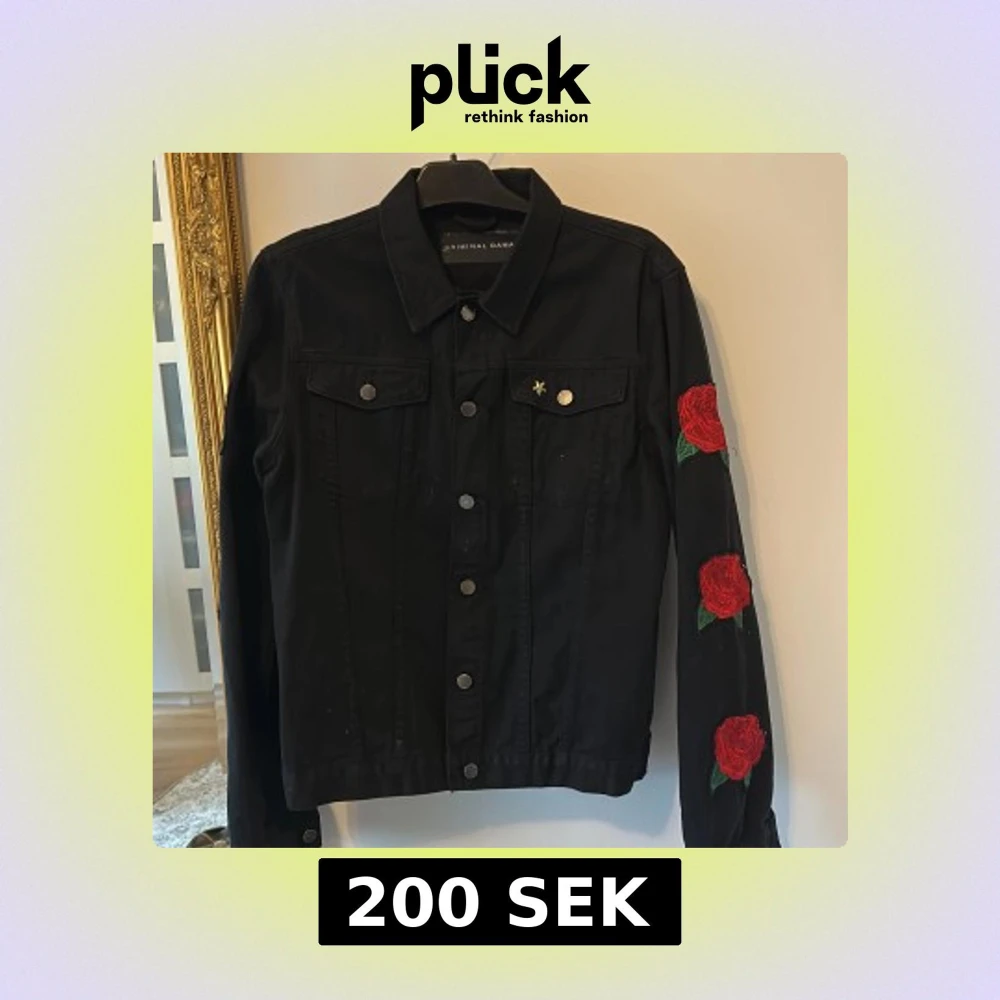Svart jeansjacka från Criminal Damage med coola broderade röda rosor längs ena ärmen. Jackan har klassisk krage, silverfärgade knappar och två bröstfickor, varav en med en liten guldfärgad stjärndetalj. Perfekt statement-plagg för dig som gillar att sticka ut.
