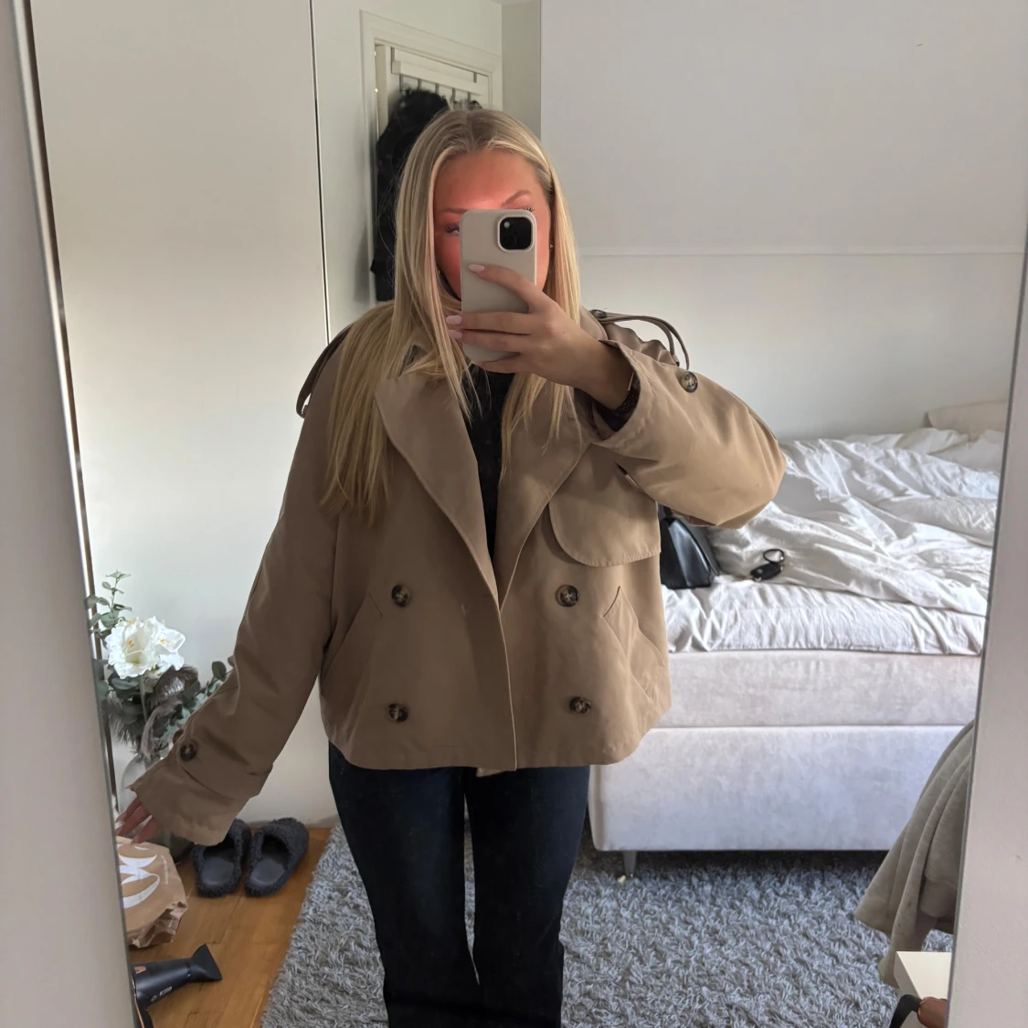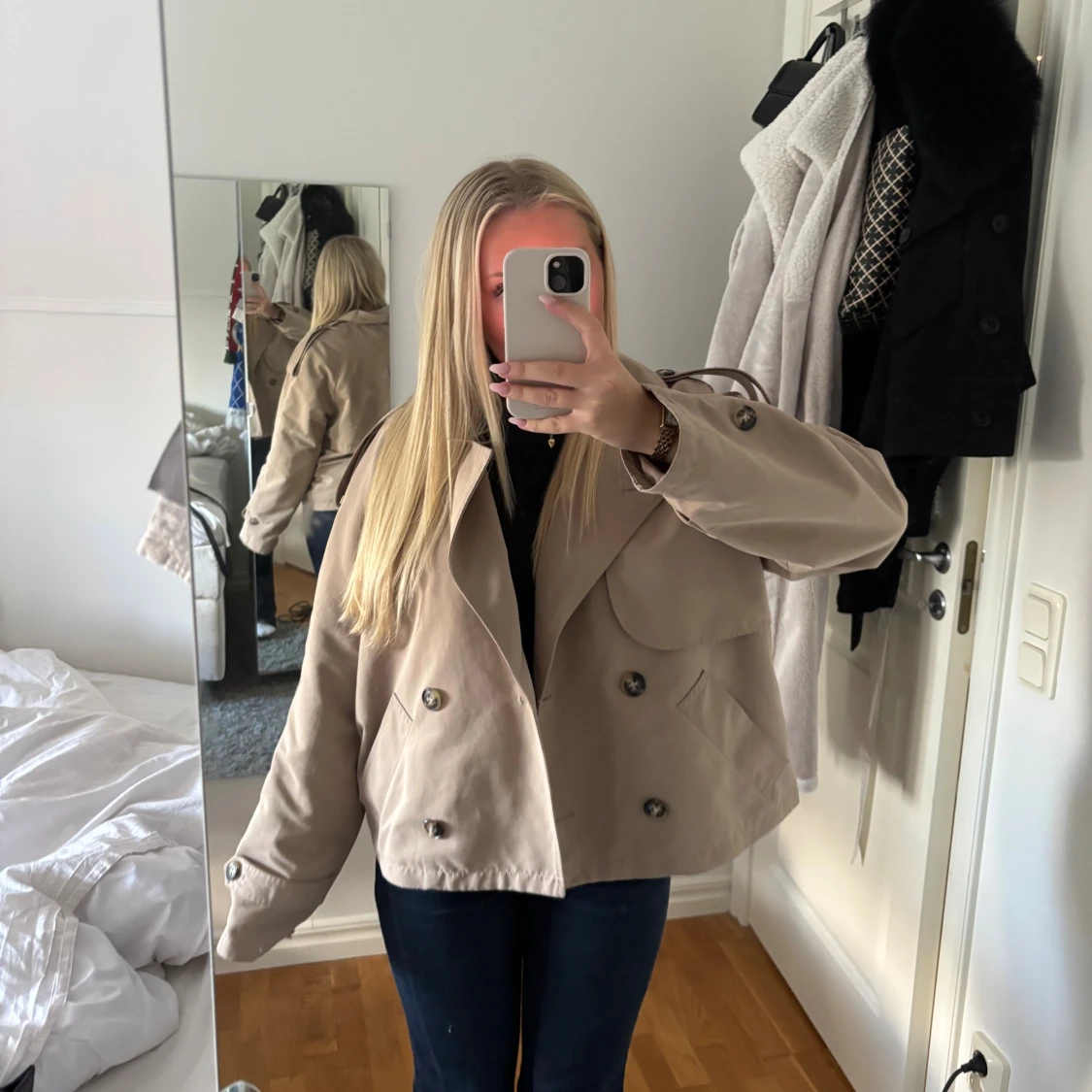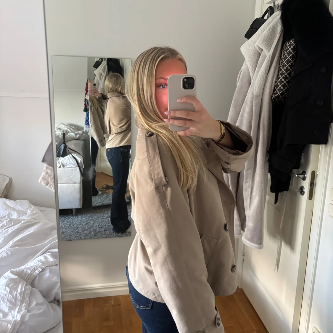 Jättefin beige trenchcoat från Vero Moda i storlek M, till referens så är jag 1,60 lång. Kommer inte till användning lika mycket då jag har andra jag använder 🩷 skriv för fler funderingar eller bilder