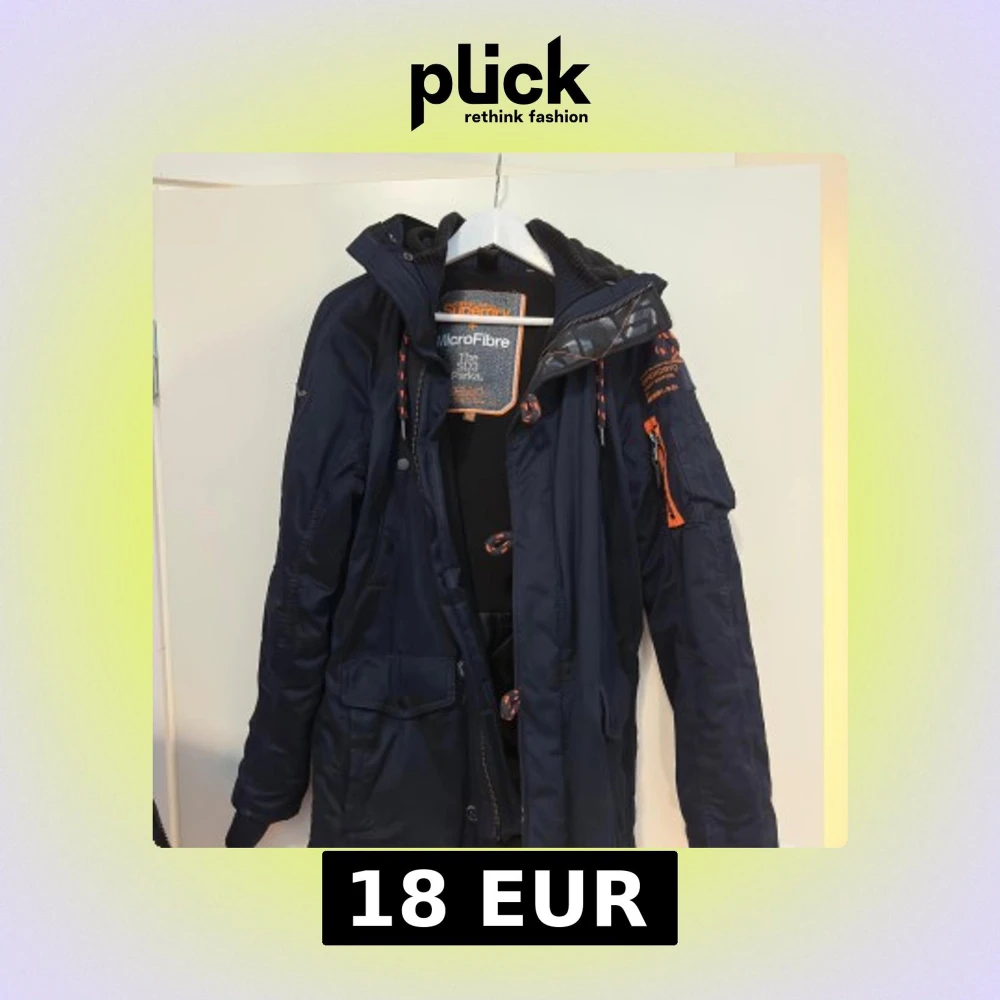 Säljer en snygg mörkblå parkajacka från Superdry med orange detaljer. Jackan har en huva med snörning och flera fickor, inklusive en med dragkedja på ärmen. Perfekt för kyliga dagar med sin MicroFibre-isolering.