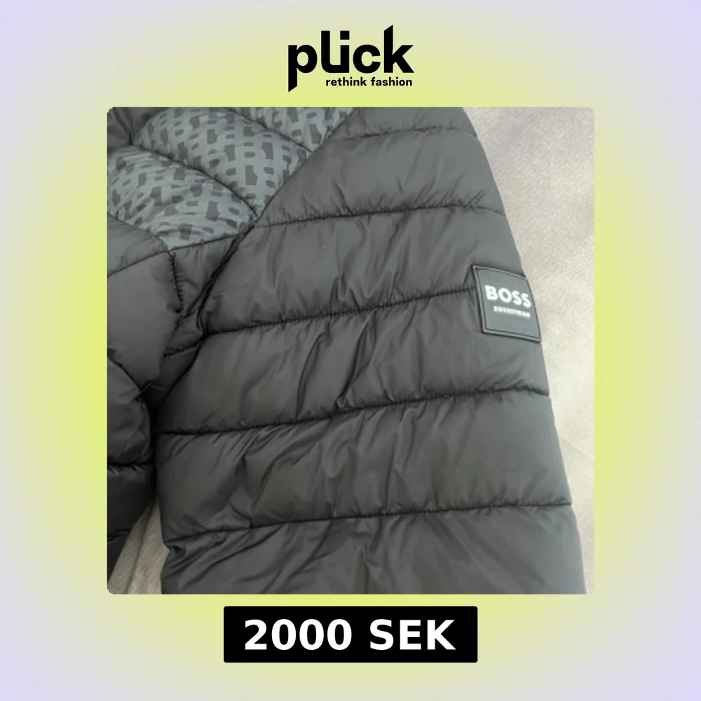 Säljer en svart puffer vinterjacka från BOSS Equestrian med huva och dragkedja. Jackan har mönstrade partier med BOSS-logga, två dragkedjefickor och snygga ränder i vitt och beige på huvan. Perfekt för kalla dagar och riktigt stilren.