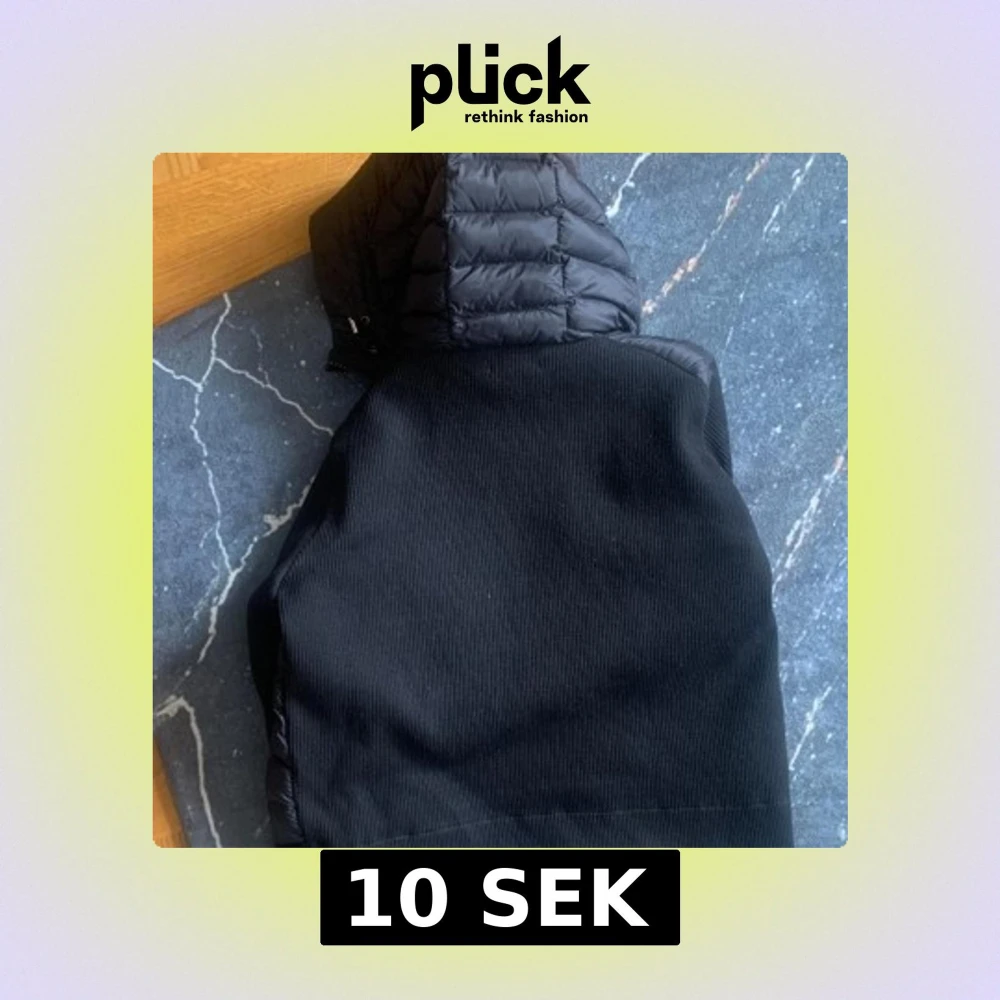 Säljer en svart jacka med quiltad huva och ribbad struktur på kroppen. Jackan har dragkedja och en sportig look, perfekt för dig som gillar stilrena plagg med lite edge.