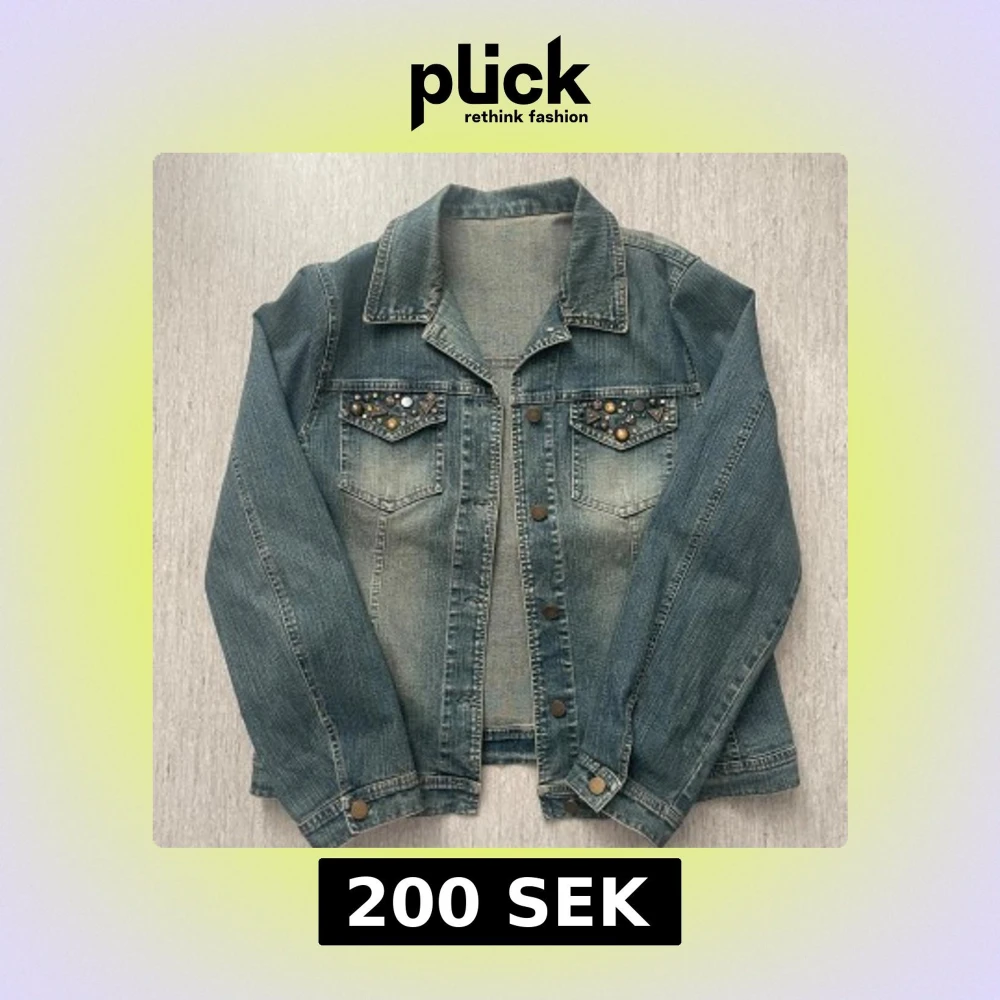 Snygg blå jeansjacka med nitar och metallknappar på bröstfickan. Jackan har långa ärmar, knappstängning framtill och sitter ganska baggy.