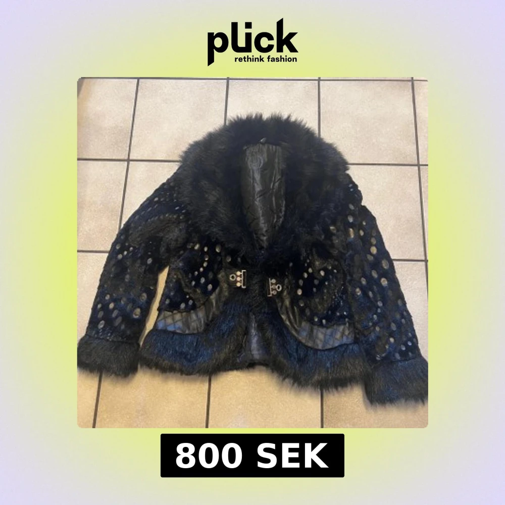 Unik svart pälsjacka med stora fluffiga krage och muddar. Jackan har ett prickigt mönster över hela ytan och quiltade detaljer vid fickorna. Stängs med två snygga metallspännen framtill. Insidan är quiltad och glansig, vilket ger extra lyxig känsla.