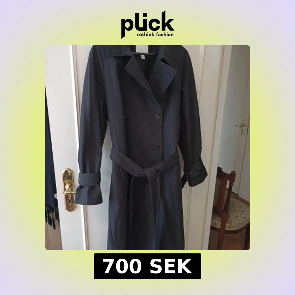 Stilren svart trenchcoat med klassisk krage, knappar framtill och matchande bälte i midjan. Jackan har långa ärmar med snygga spänndetaljer vid handlederna. Perfekt för dig som vill ha en tidlös och clean look.