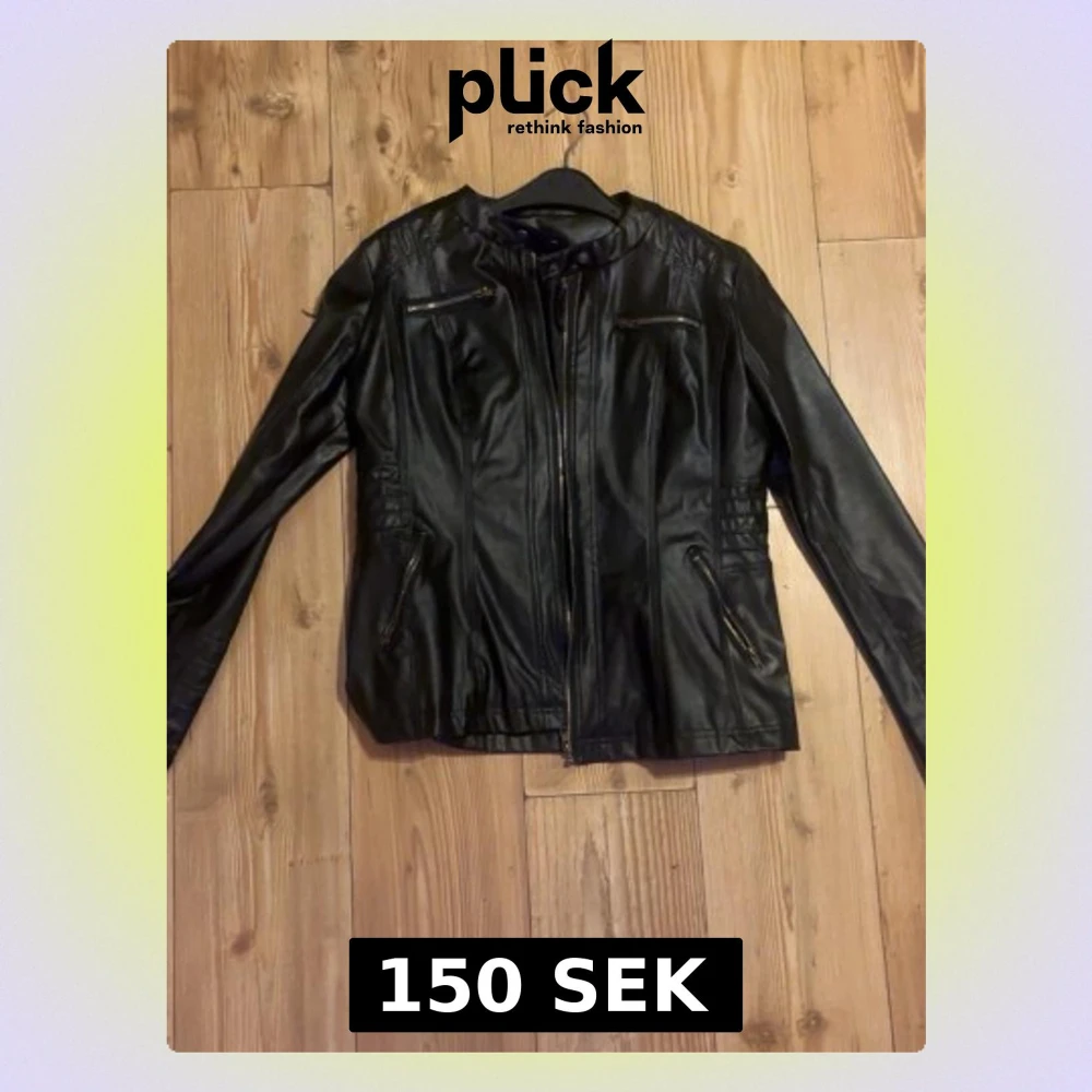 Snygg svart skinnjacka med flera dragkedjor och ståkrage. Jackan har fyra fickor med dragkedja och markerade sömmar som ger en cool look. Perfekt för dig som vill ha en stilren och edgy jacka till vardagsoutfiten. Aldrig använd