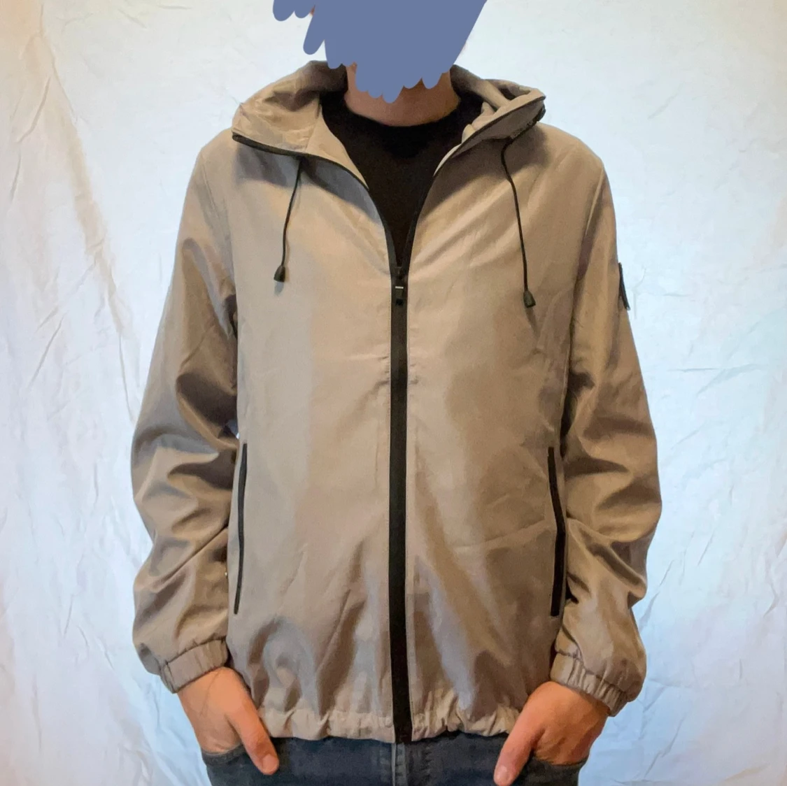 Snygg beige vindjacka med svart dragkedja och huva med snörning. Jackan har elastiska muddar vid ärmslut och nederkant samt två fickor med svarta detaljer. Perfekt för blåsiga dagar och enkel att matcha med olika outfits. Passar M