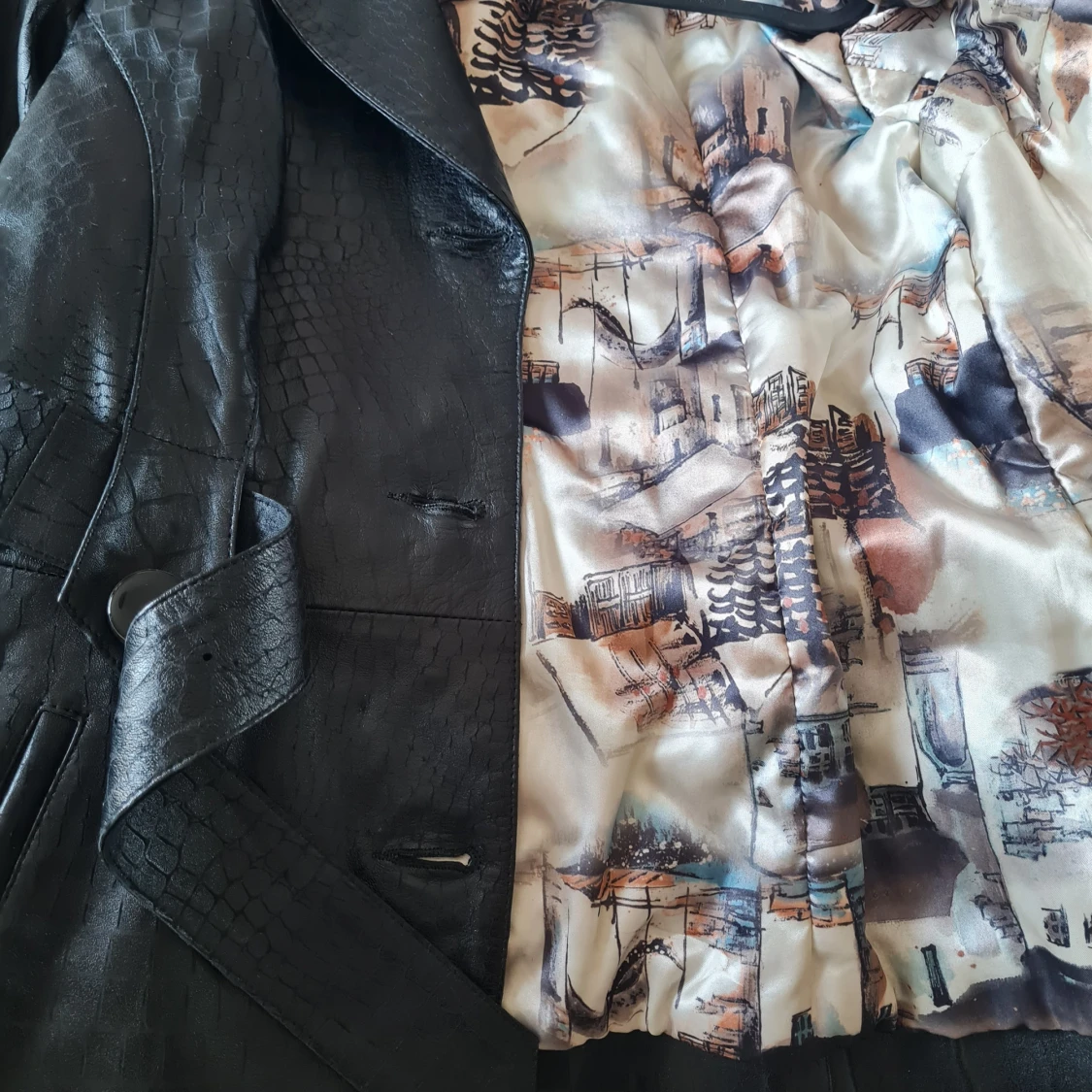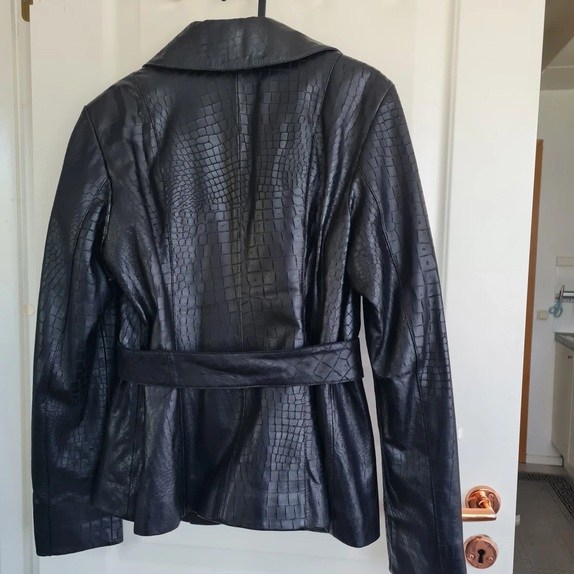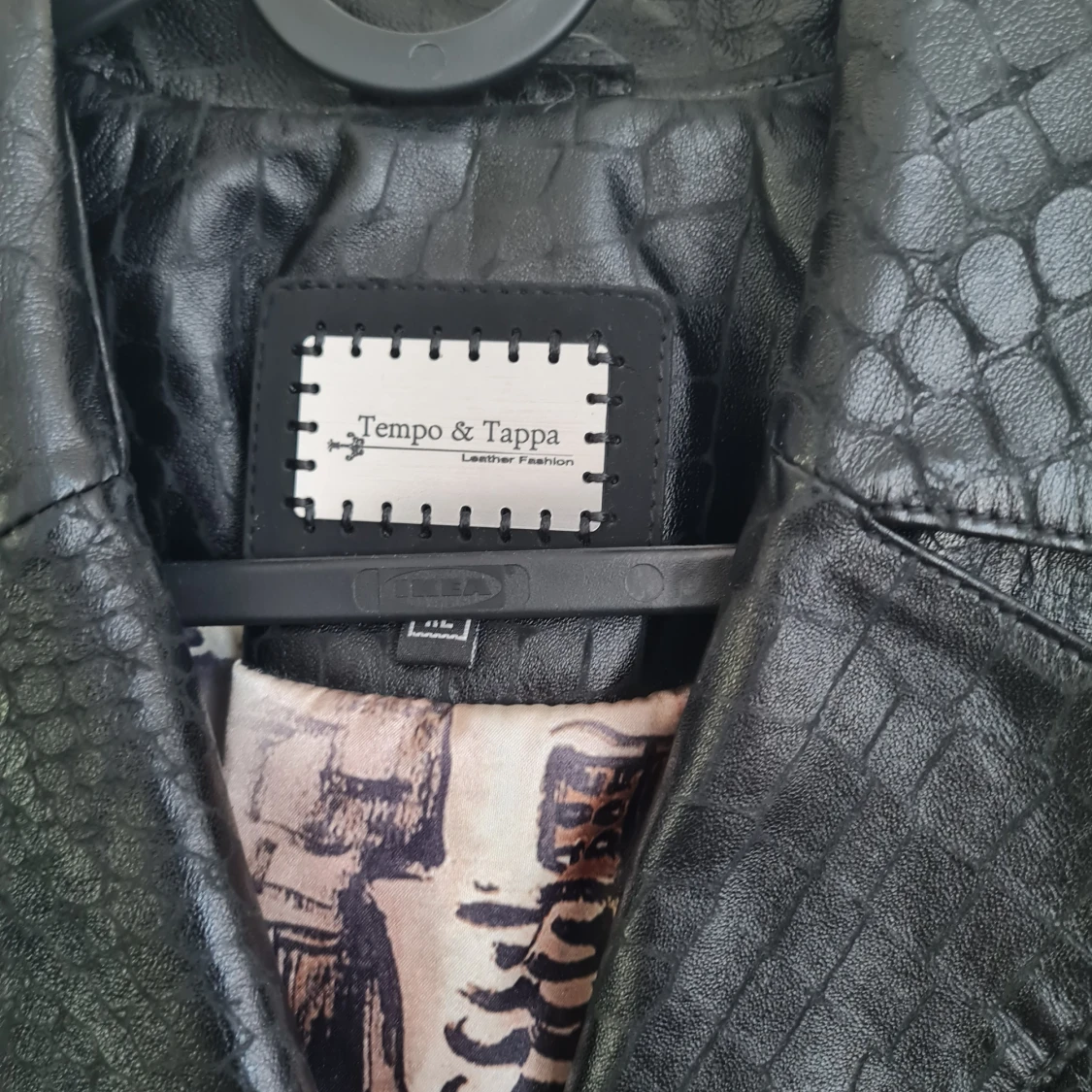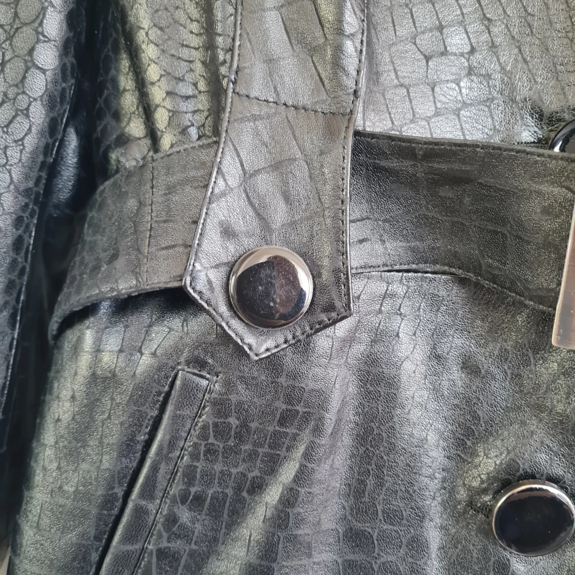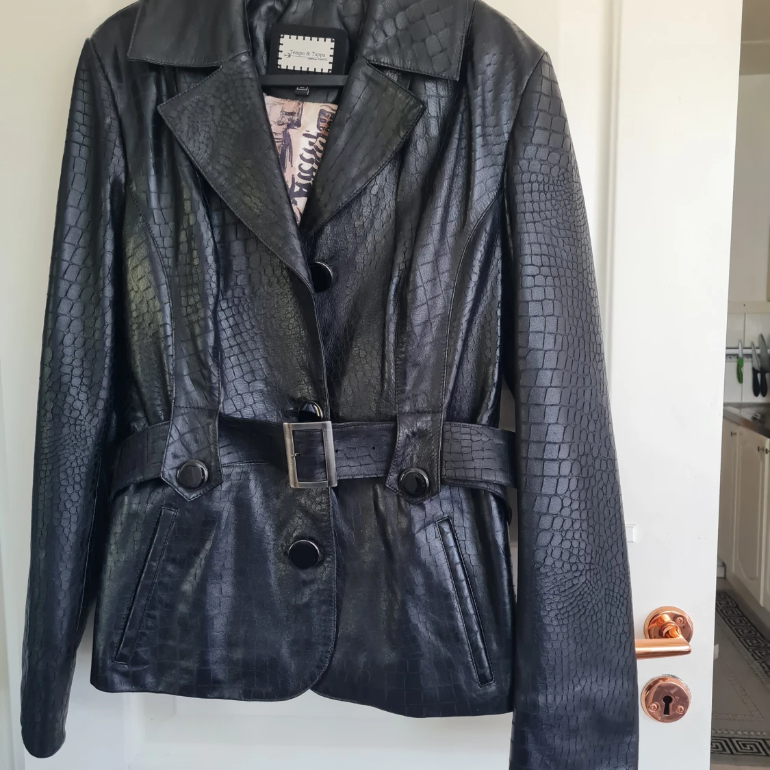 Snygg svart skinnjacka med croco-mönster från Tempo & Tappa. Jackan har bälte i midjan, knappar framtill och långa ärmar. Fodret har ett unikt tryck. Perfekt för dig som vill sticka ut med en cool look.