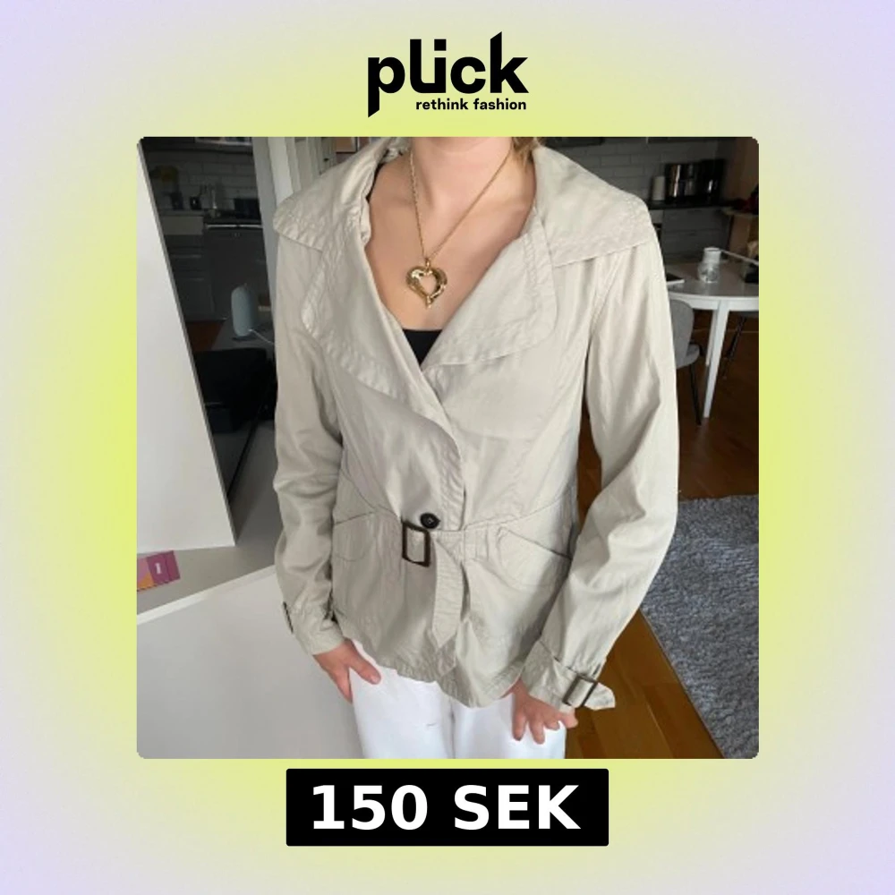 Snygg beige trenchcoat med bred krage och bälte i midjan. Jackan har stora fickor framtill, knappar och spännen vid ärmsluten för extra stil.
